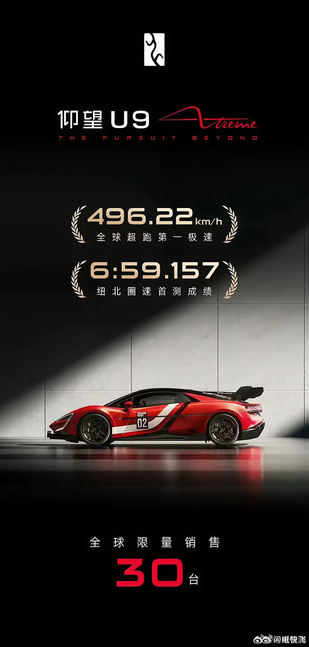 仰望U9X全球限量30台,当场全部售罄,其中28台被海外富豪预订,国内仅2台。该车实测极速达496.22km/h,超越布加迪等燃油超跑,登顶全球量产车极速榜首。同时以6分59秒157的成绩,成为纽博格林北环赛道首款跑进7分钟的量产纯电超跑,两项纪录直接打破国外品牌对性能领域的百年垄断。
