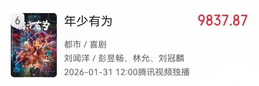 第六名 《年少有为》主演: 彭昱畅、林允、刘冠麟