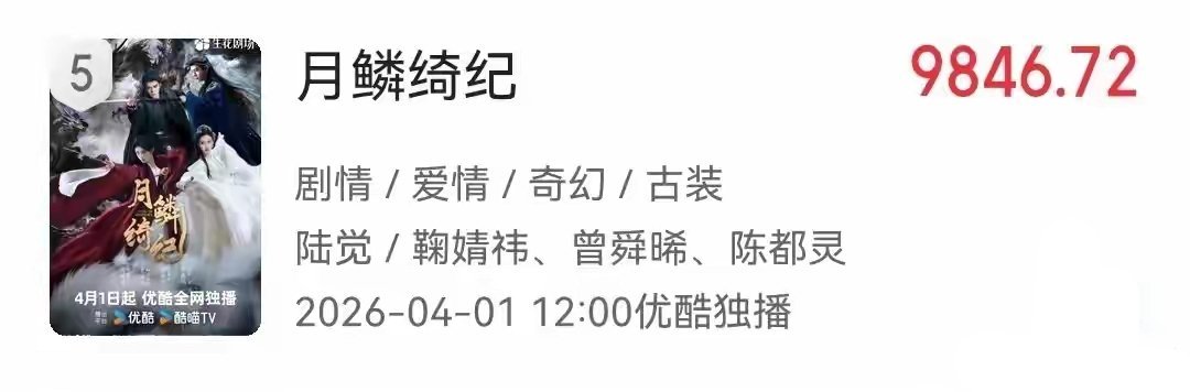第五名 《月鳞绮纪》主演: 鞠婧祎、曾舜晞、陈都灵、田嘉瑞