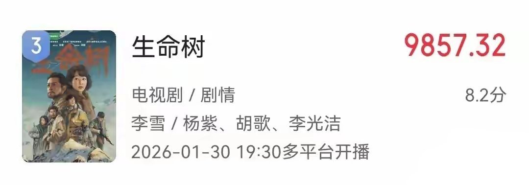 第三名 《生命树》主演: 杨紫、胡歌、李光洁、梅婷