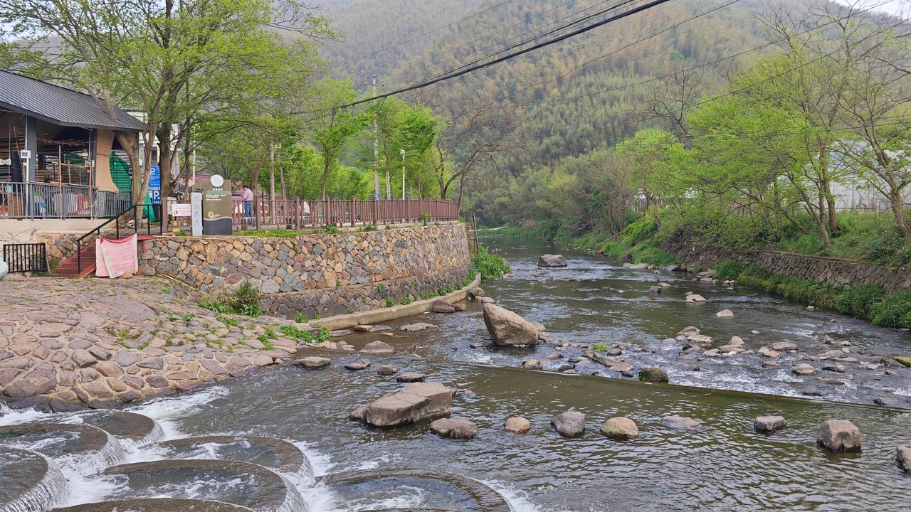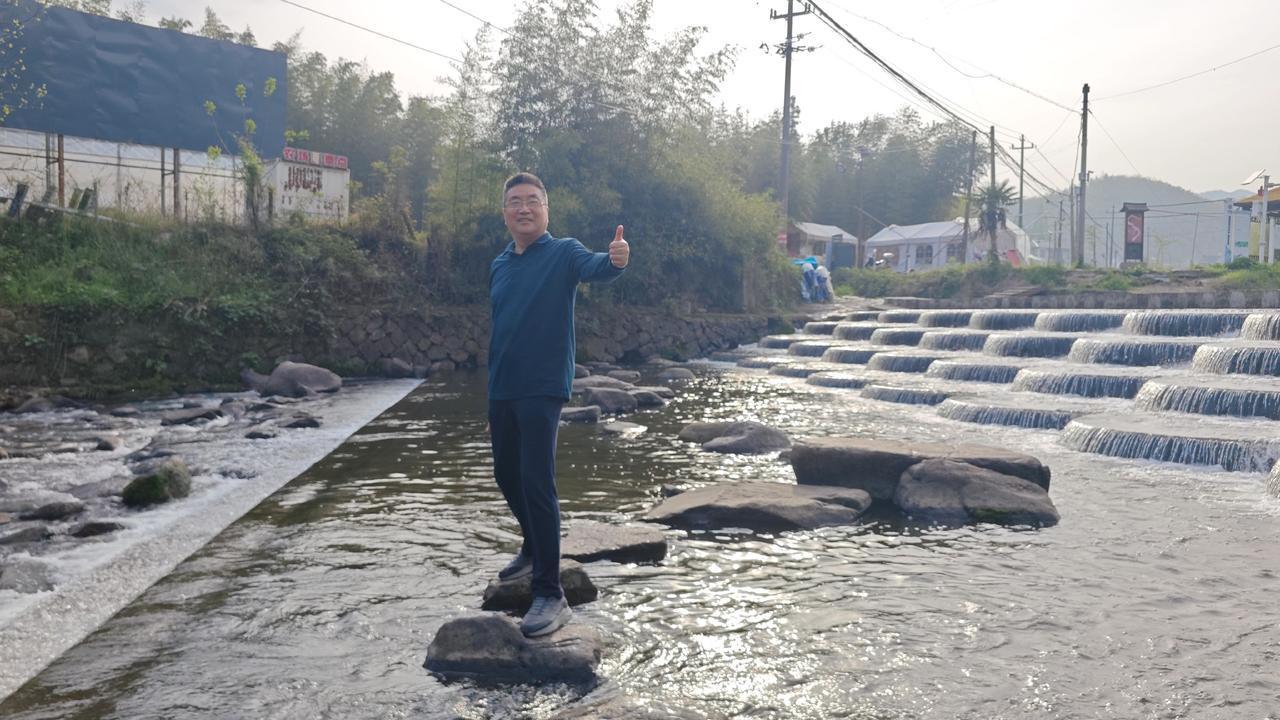 导航到四合村,沿着庾线往里走,溪水先于坝体闯进视野。两岸翠竹遮天蔽日,风穿过竹梢的声响,混着溪水淌过石头的叮咚,刚下车就被这股清凉裹得严严实实 。坝体就在眼前,42个弧形蓄水池铺成四级台阶,像给溪水铺了层鱼鳞状的绒毯,阳光一照,水面泛着细碎的光,晃得人心里软乎乎的 。
