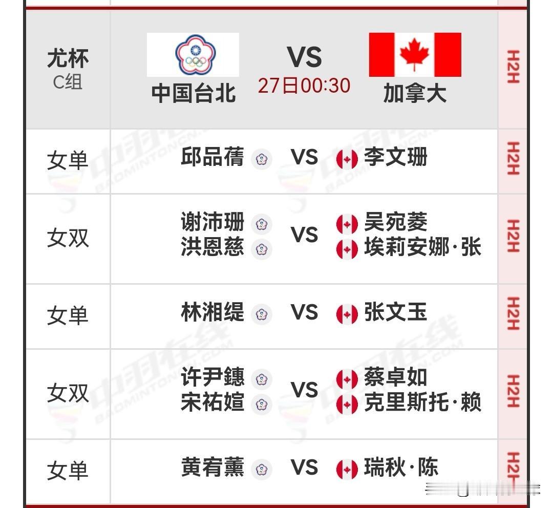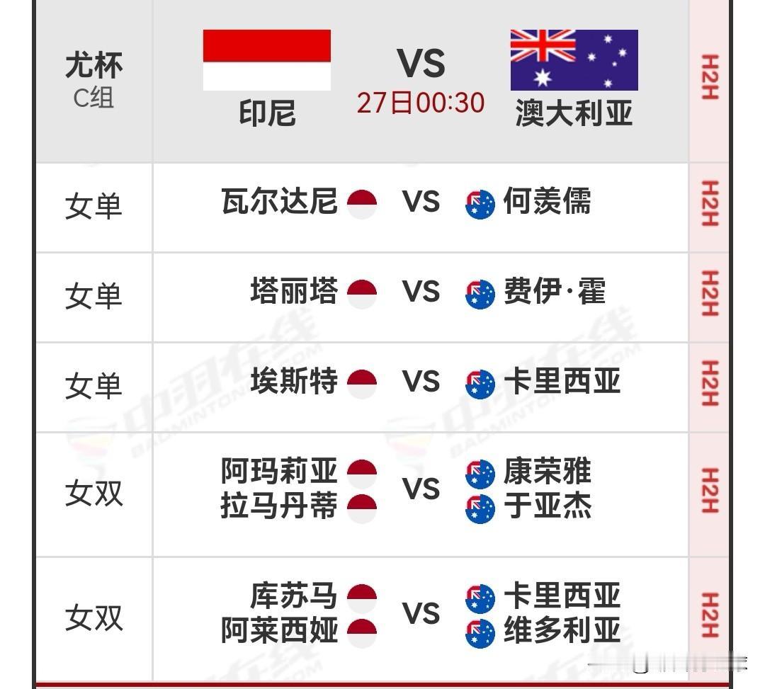 4月27日2026汤尤杯小组赛00:30时段对阵名单