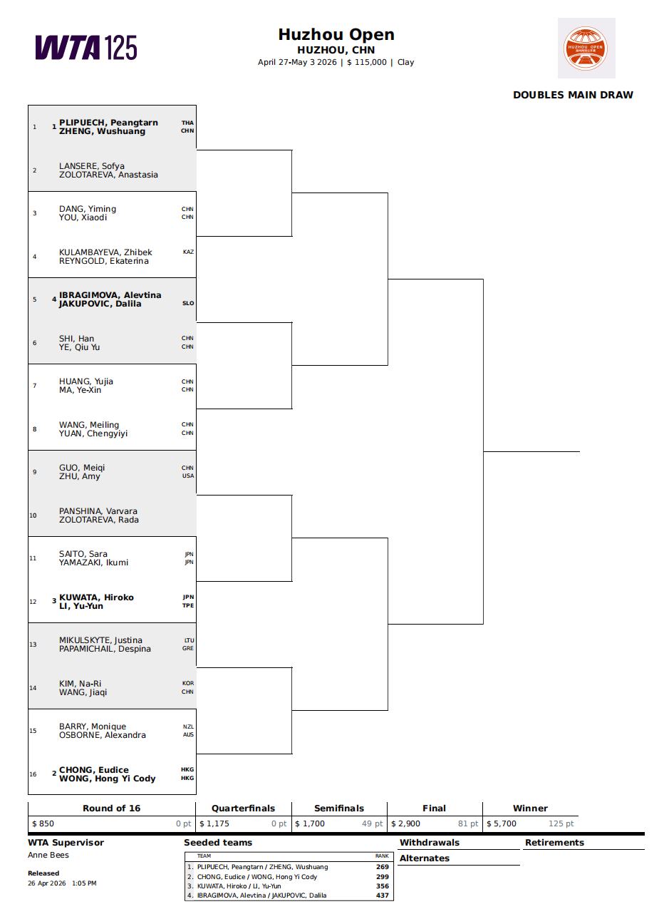 双打签表同样看点颇多,跨国组合郑妩双/潘塔恩·普利普奇与中国香港组合王康怡/张玮桓领衔阵容。此外,党一鸣/尤晓迪、施晗/叶秋语、马烨欣/黄裕迦、王美玲/袁程依依四对中国组合参赛,另有两位中国选手郭美琪(搭档朱玉麒)、王佳祺(搭档金娜丽)参与女双角逐。