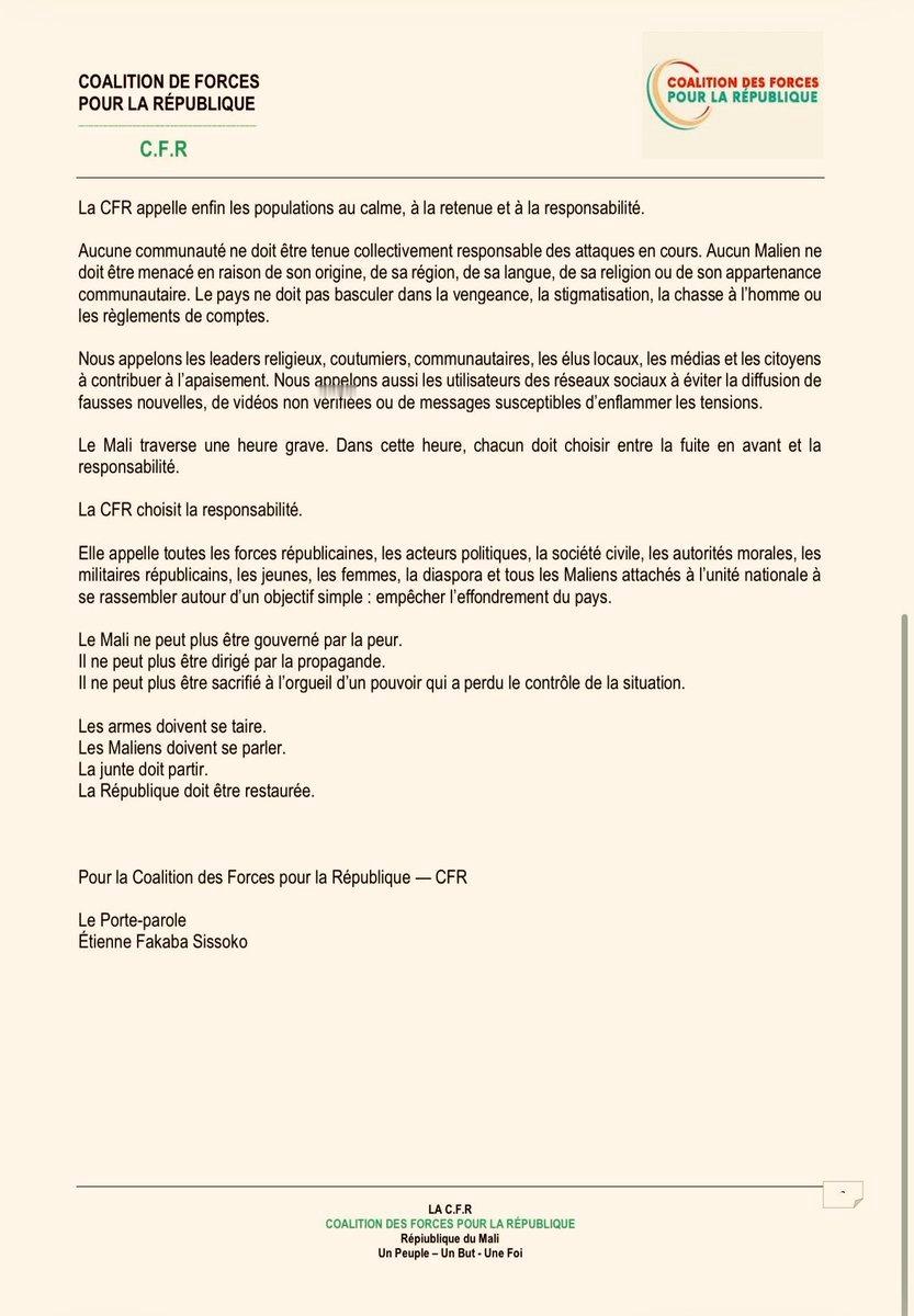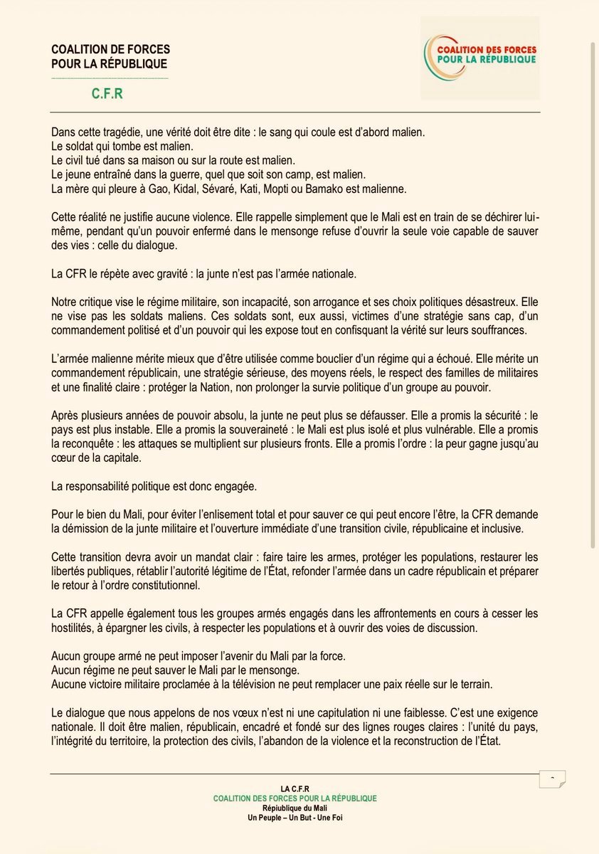 🇲🇱❗马里反对派集团“马里共和力量联盟”发表声明: