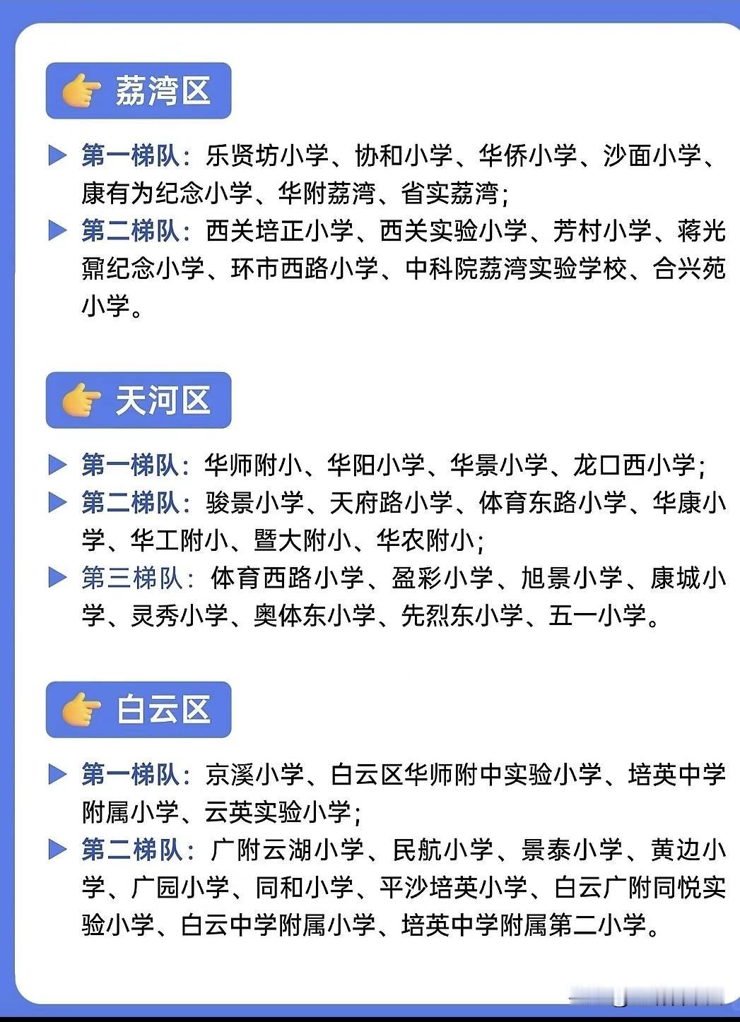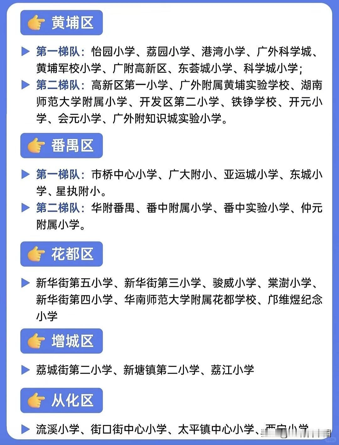 广州优质小学梯队榜单出炉,各区教育资源分布一目了然 越秀、天河、荔湾等11个区的热门小学按实力划分梯队,越秀区东风东路小学、天河区华师附小、荔湾区乐贤坊小学等老牌名校稳居第一梯队,南沙、黄埔等新区学校也凭借亮眼表现跻身前列。 广州中小学排名