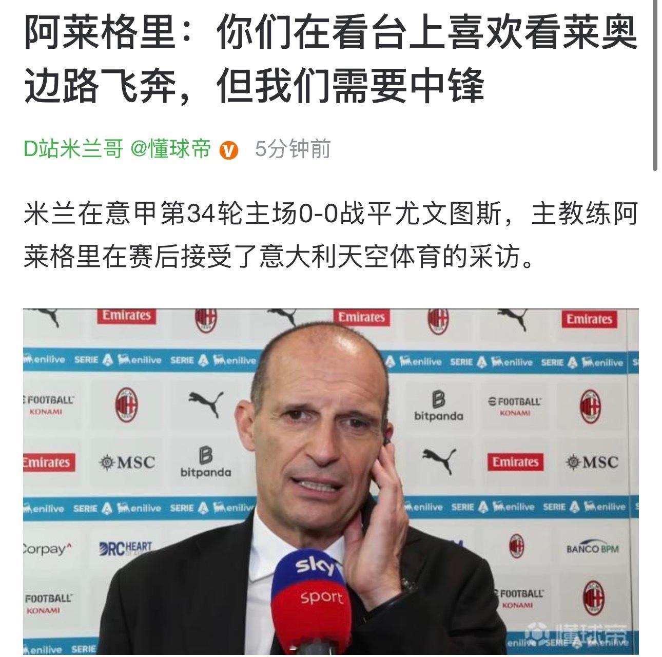 说白了就是,把莱奥放在边路飞奔,中锋谁踢?我们早就说过,阿莱格里不傻,莱奥踢中锋是不得不的选择。