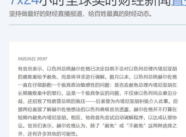 4月26日纽约时报独家确认,以色列总统赫尔佐格正式决定,暂时不会特赦总理内塔尼亚胡的腐败案,他没有选赦免或者不赦免这两个极端选项,而是要先启动调解程序,争取让内塔尼亚胡达成认罪协议。