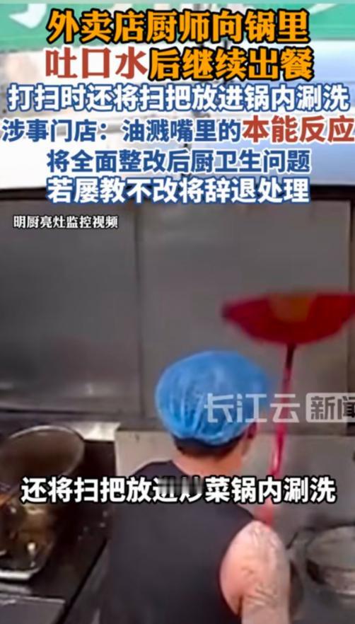 广东佛山,男子点了份餐正准备吃,骑手给他发来一段视频,视频里厨师往锅内吐了口口水,接着添加食材进行烹饪,拿扫把在锅内涮洗后清洁灶台墙面。这事闹大后,餐馆回应,说是厨师嘴内溅了油的本能反应,已全面整改后厨卫生问题。