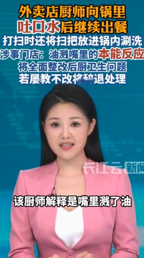 他表示,经过询问,涉事厨师称自己往锅里吐口水,是因为烹饪时热油溅进了嘴里,属于本能反应,还将这种严重的违规行为轻描淡写地定性为“有失厨德”。