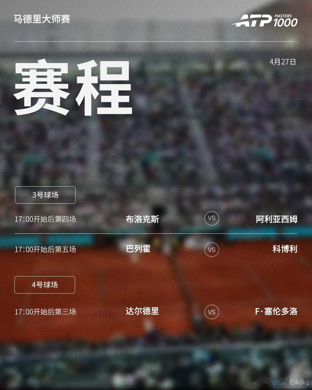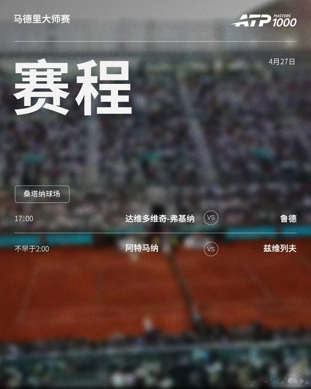 ATP1000 马德里大师赛周一赛程如下(均为北京时间)👀