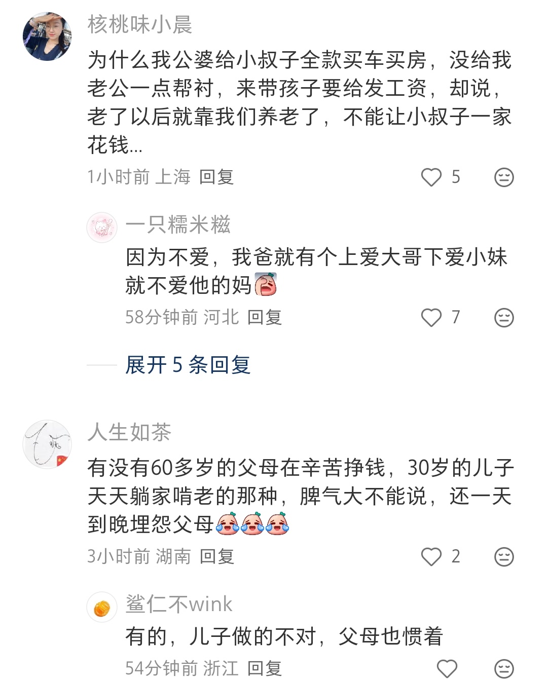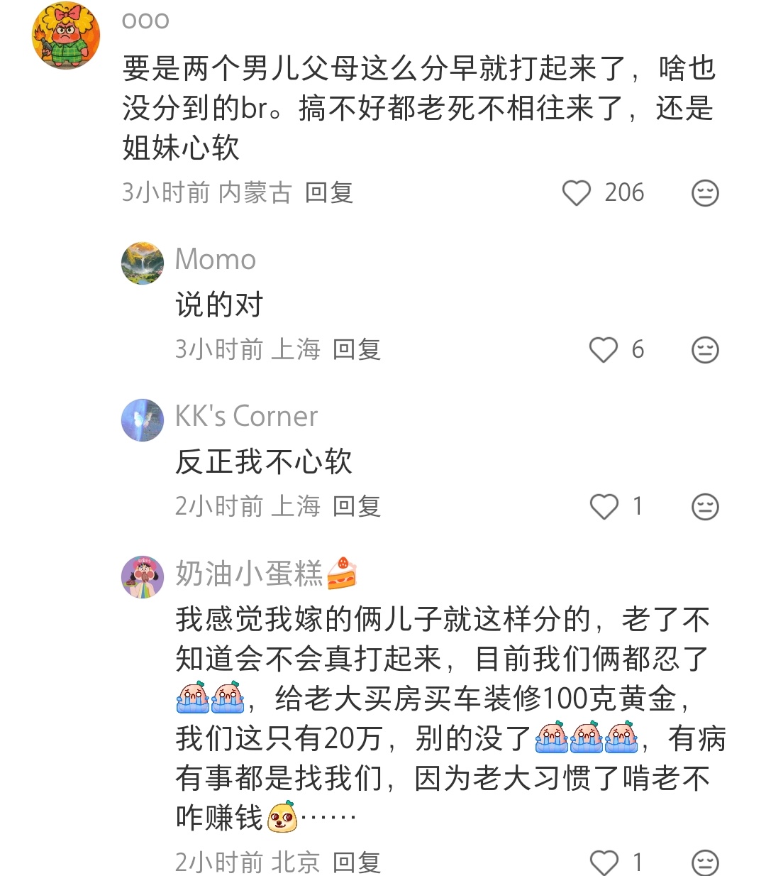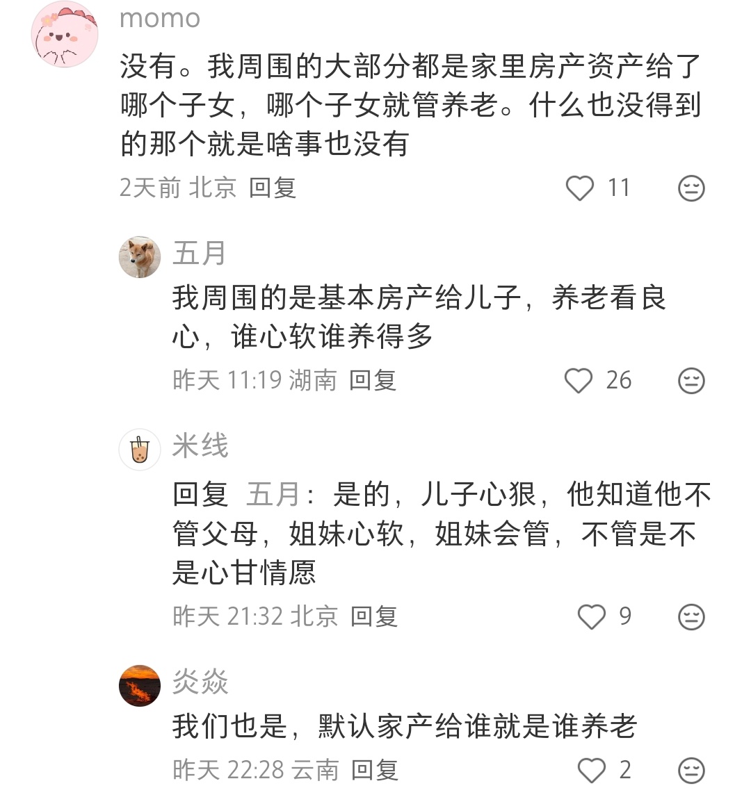 虽然表面上老人都是跟儿子过的,意思是财产给谁,就是谁养老。但其实能动的时候也是帮儿子干活或者带孩子。女儿每年还要给孝敬。等生病或者不能动了,女儿一样要负责一部分医疗费。所以财产是实打实给儿子的,但养老大部分是虚假的