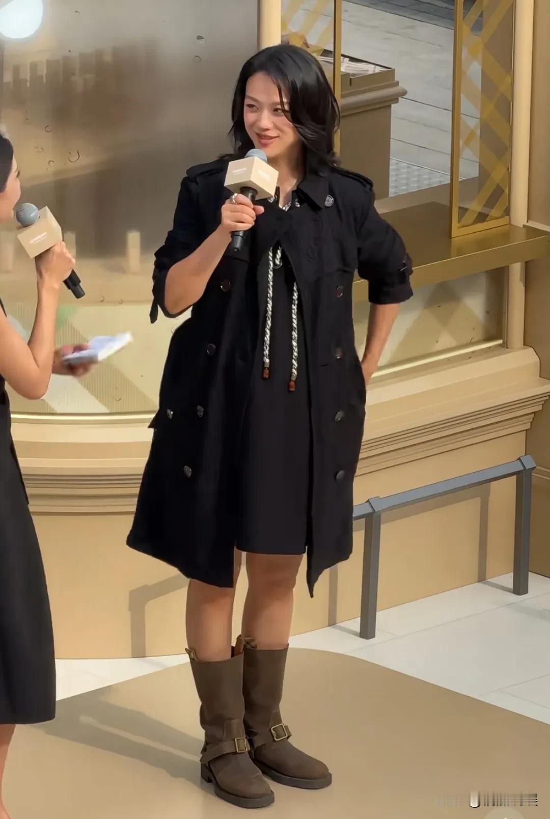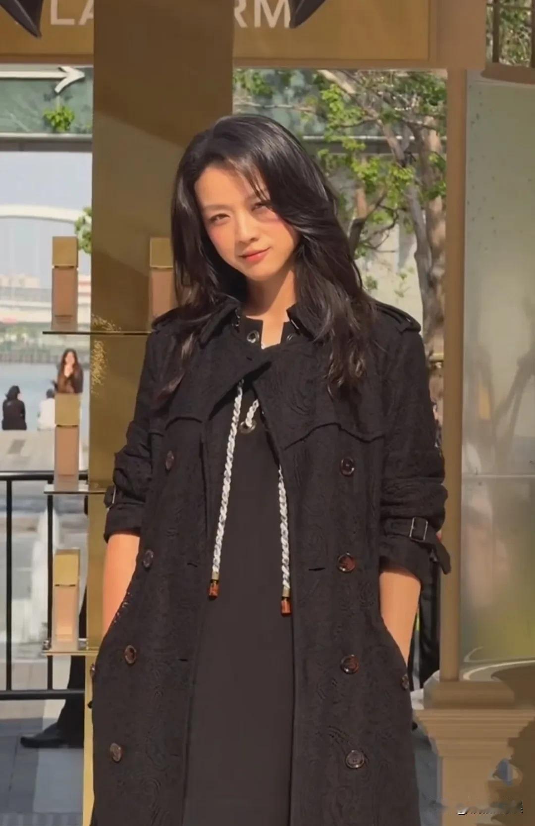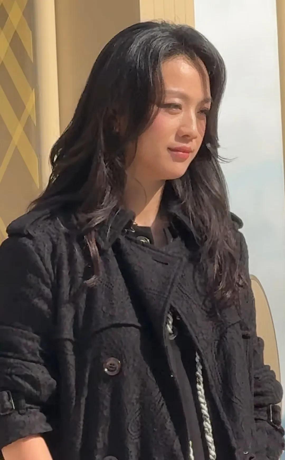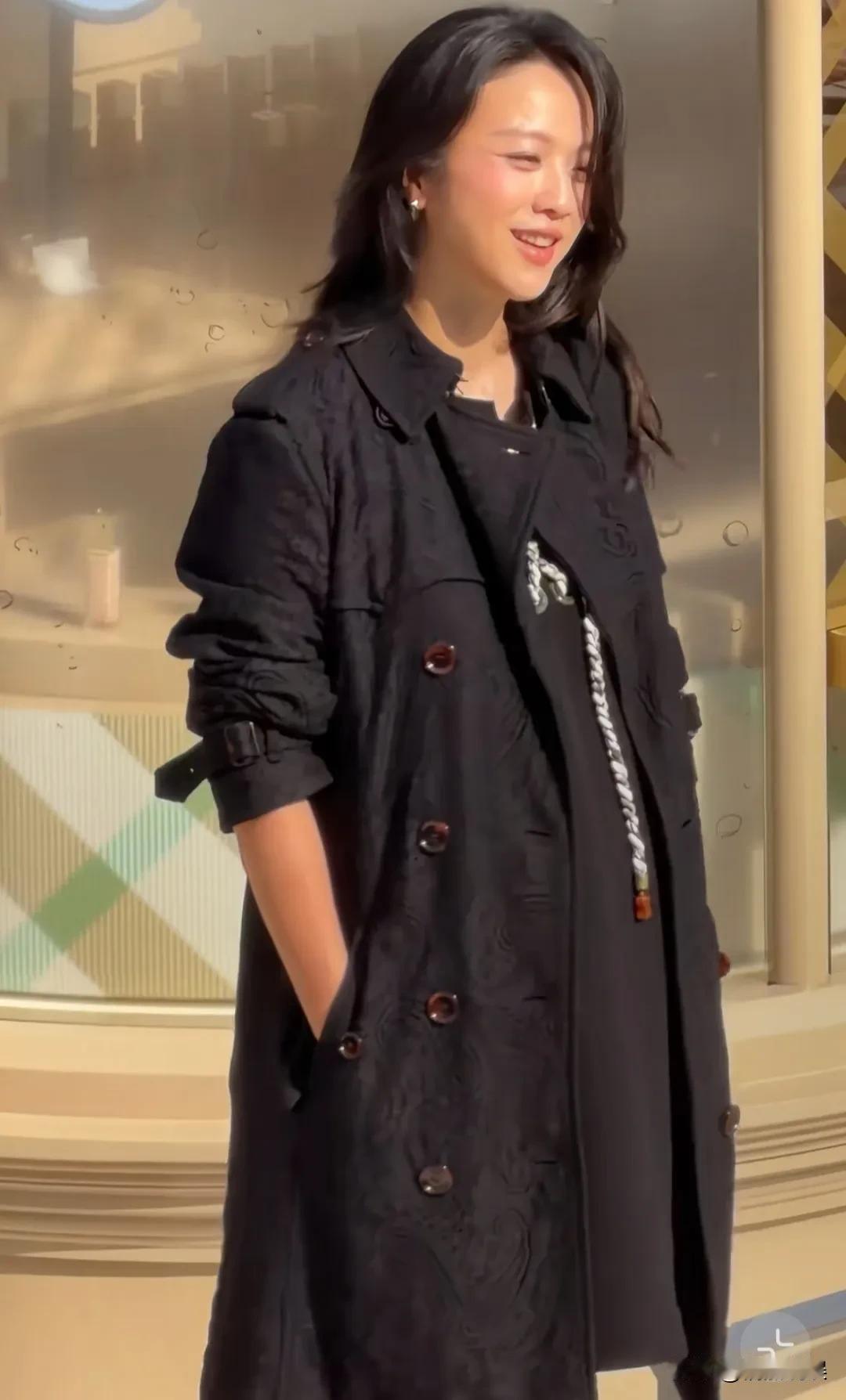 穿着黑色呢大衣的她,内搭长卫衣,露出又细又长的小腿,一头长卷发松松的披在肩上,脚踩靴子,面容柔和,松弛感十足。