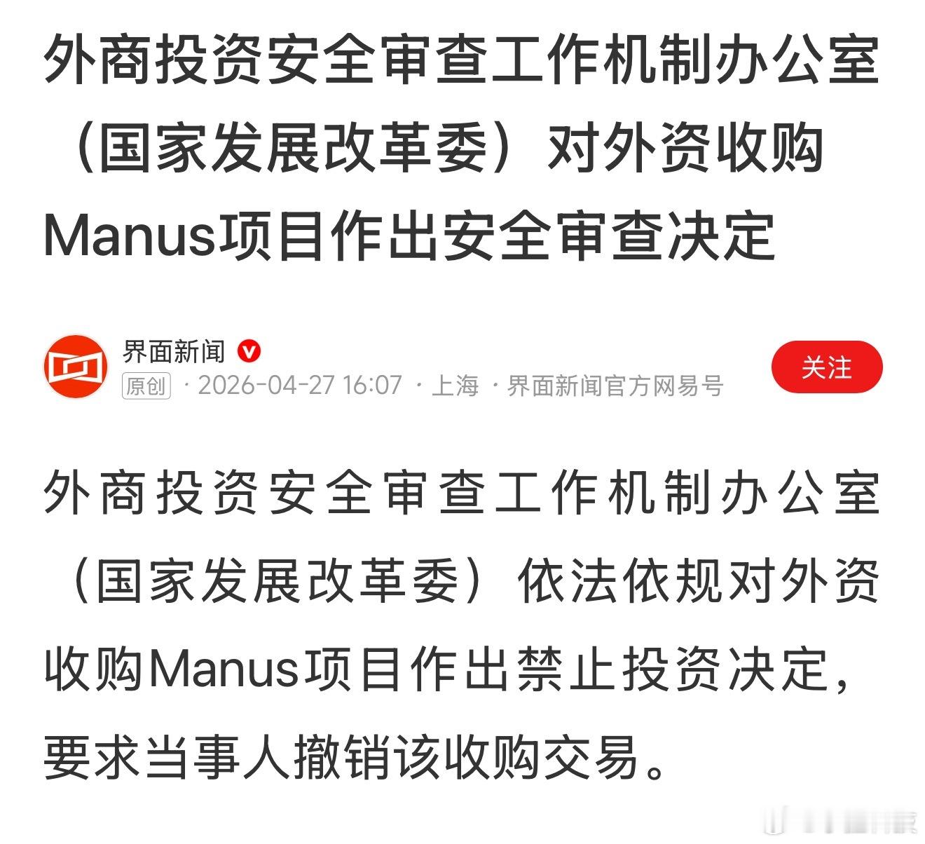禁止外资收购Manus项目不知道创始人现在国内还国外。如果已经卖掉,那不至于现在再来发个禁止出售,应该是谈好了,还没成交。