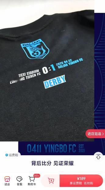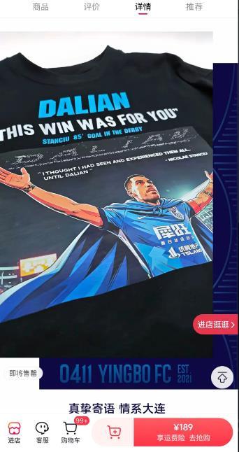 大连英博俱乐部售卖的这款T恤,售价198元,纪念 T恤正面是德比之战开场闪光灯 tifo 及斯坦丘打入天外飞仙庆祝画面,背面是德比之战的最终比分。