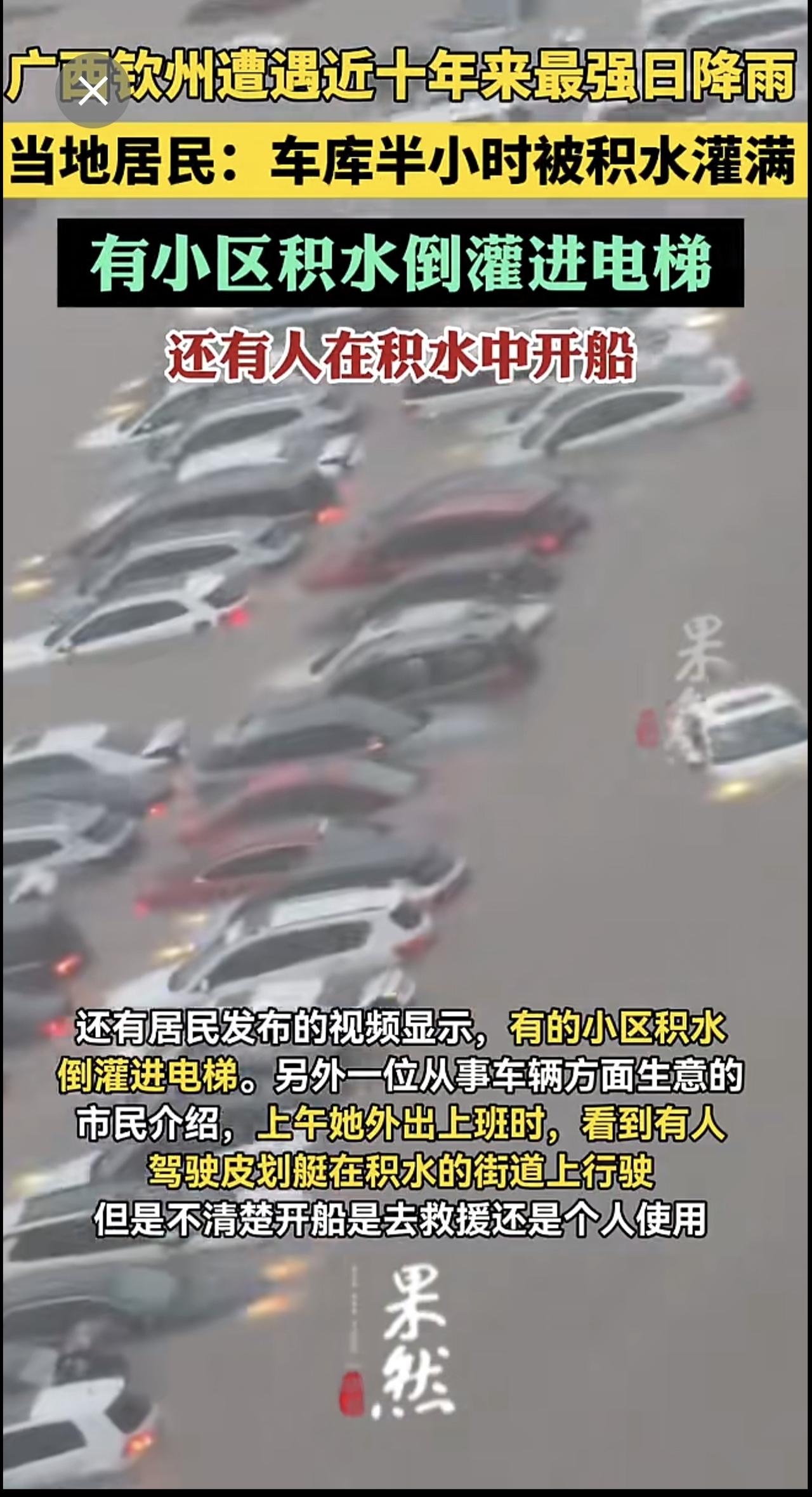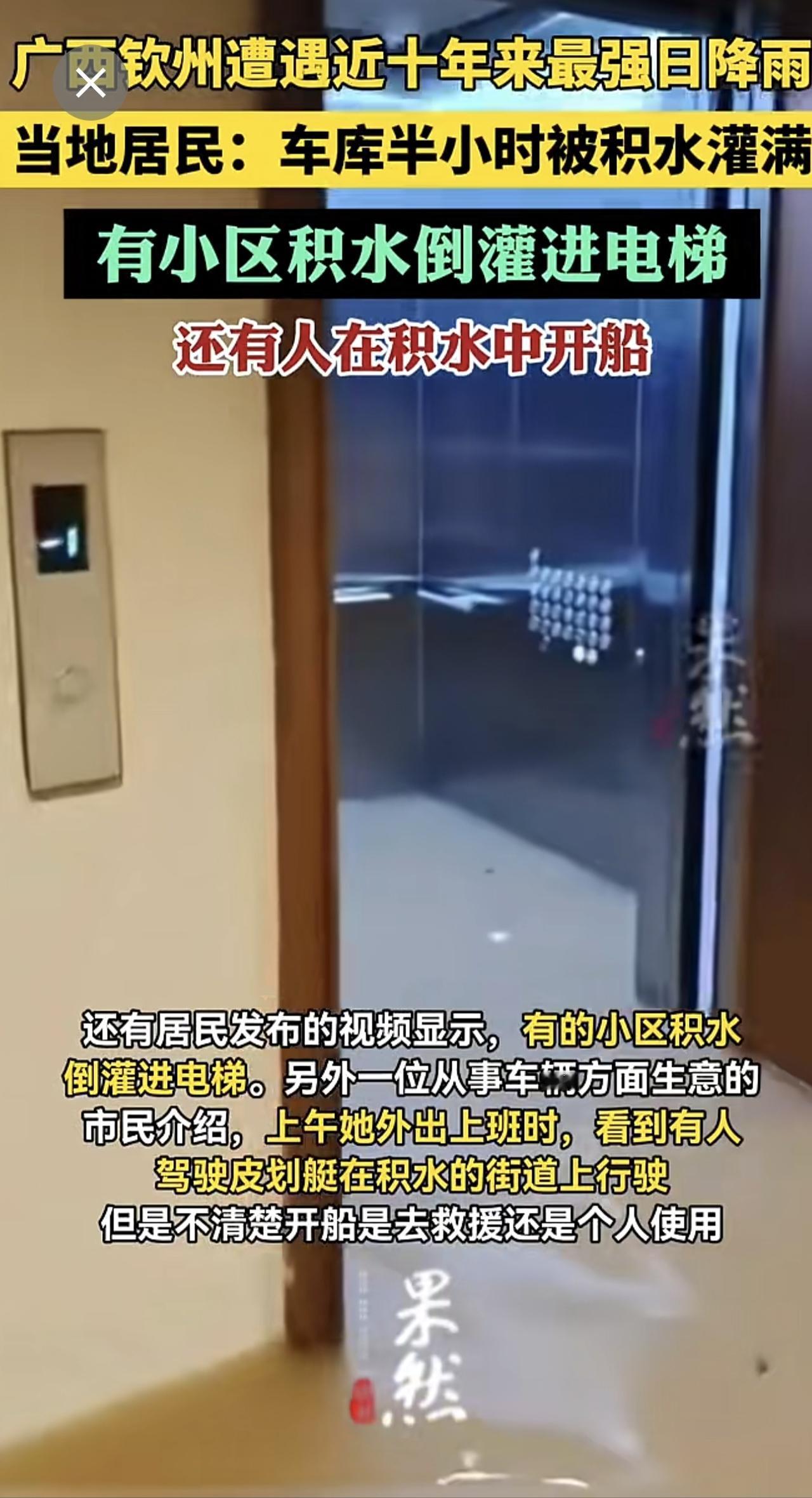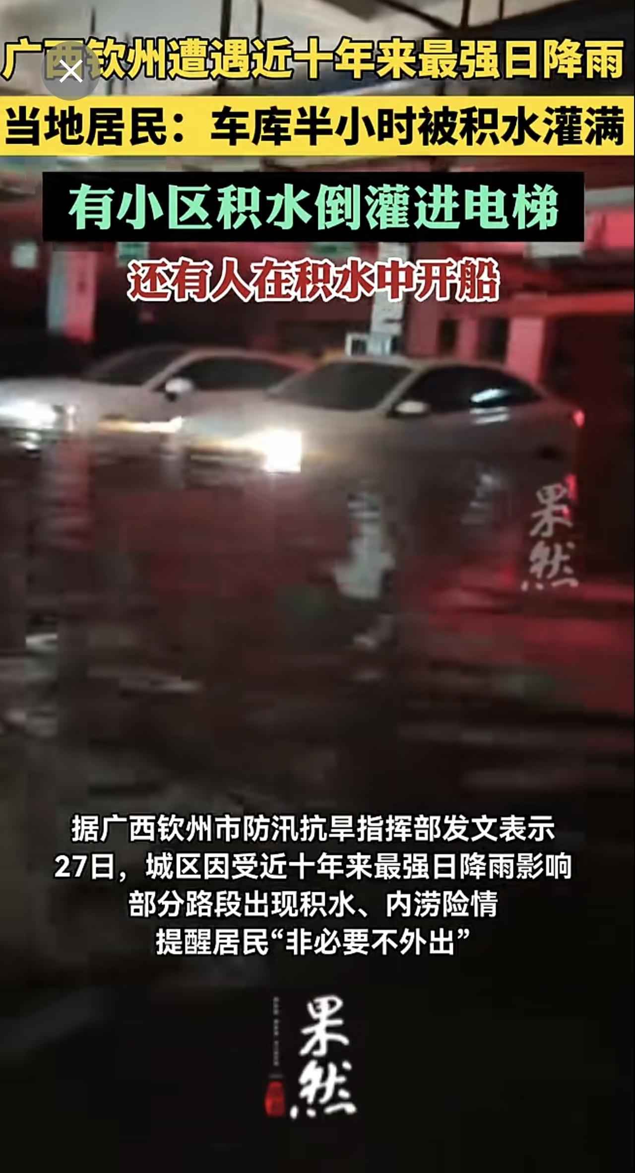 广西一地遭遇近十年来最强日降雨,当地居民:车库半小时被积水灌满,还有人在积水中开