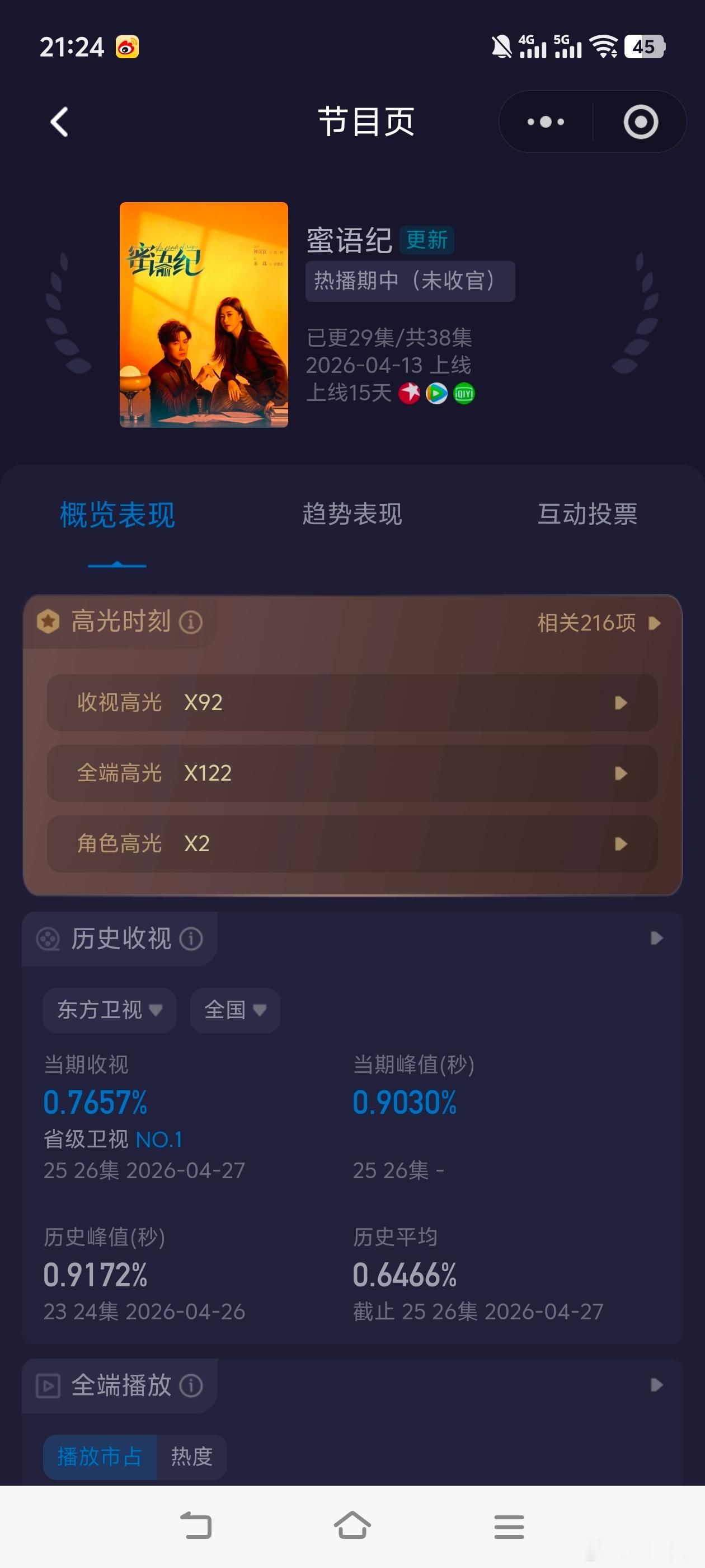 蜜语纪 《蜜语纪》周一收视依旧强势!酷云峰值0.9030,平均0.7657新高!如果后面每天都是2集连播就好了!