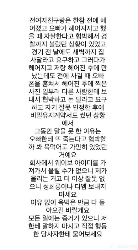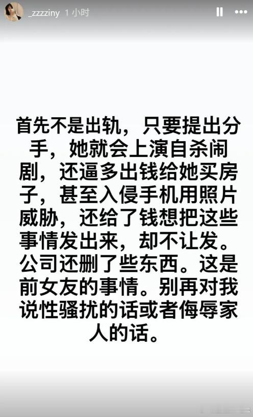 怎么韩国那边都不睡觉的刚看到Rookie女友发文:首先不是出轨,只要提出分手,她就会上演ZS闹剧,还逼多出钱给她买房子,甚至入侵手机用照片威胁,还给了钱想把这些事情发出来,却不让发,别再对我说X骚扰的话或者侮辱家人的话!