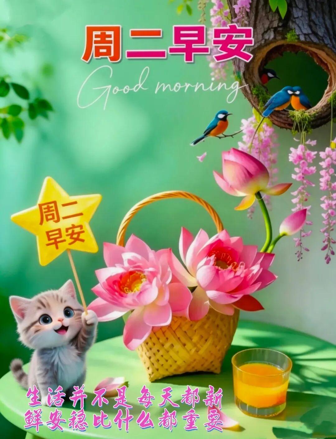 新的一天,愿美丽的阳光☀️美丽你的心情,好运与你相伴行🍀。不忙碌,不烦恼,绽放你的微笑😄,感受生活的美好🌈,把幸福紧紧拥抱🤗,周二早上好!