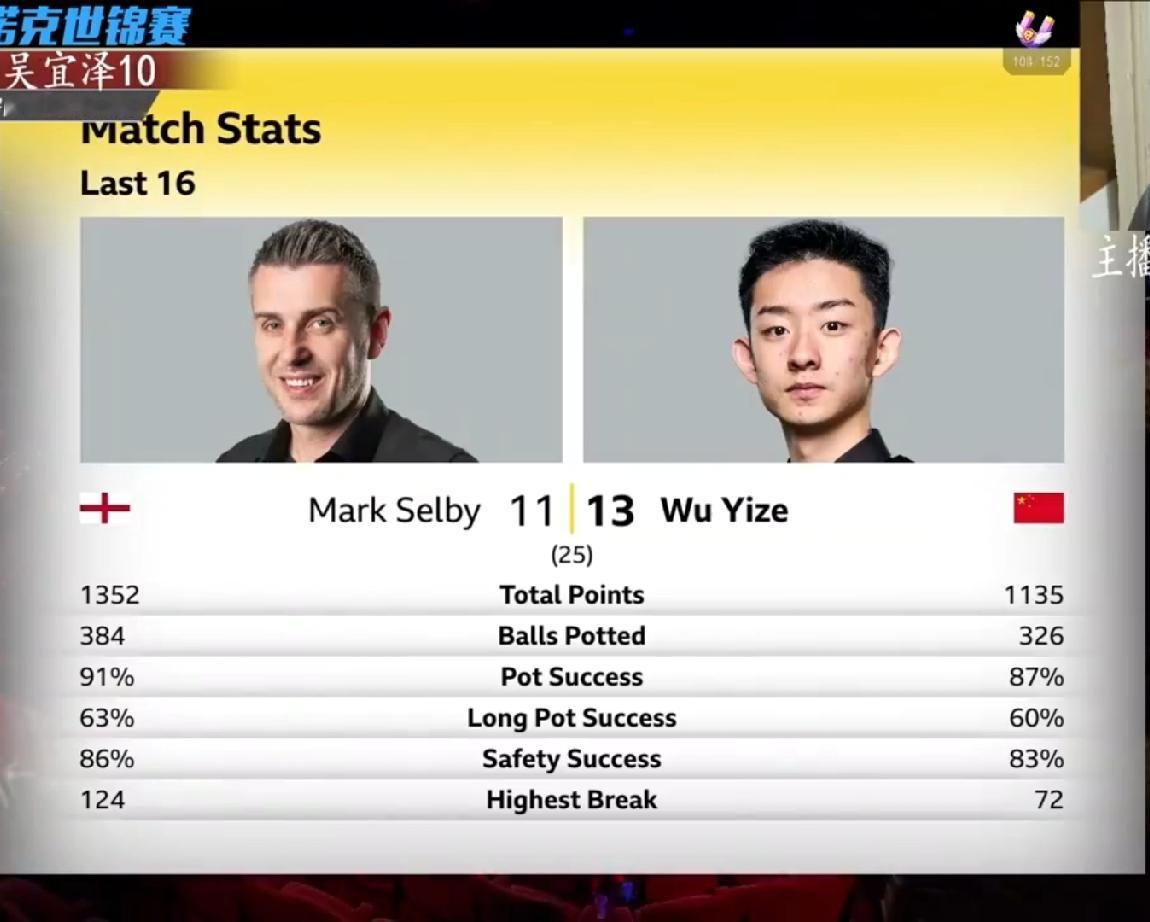 6项数据统计,全面落后,最神奇的是吴宜泽13:11多赢了2局,总得分还少了217分。