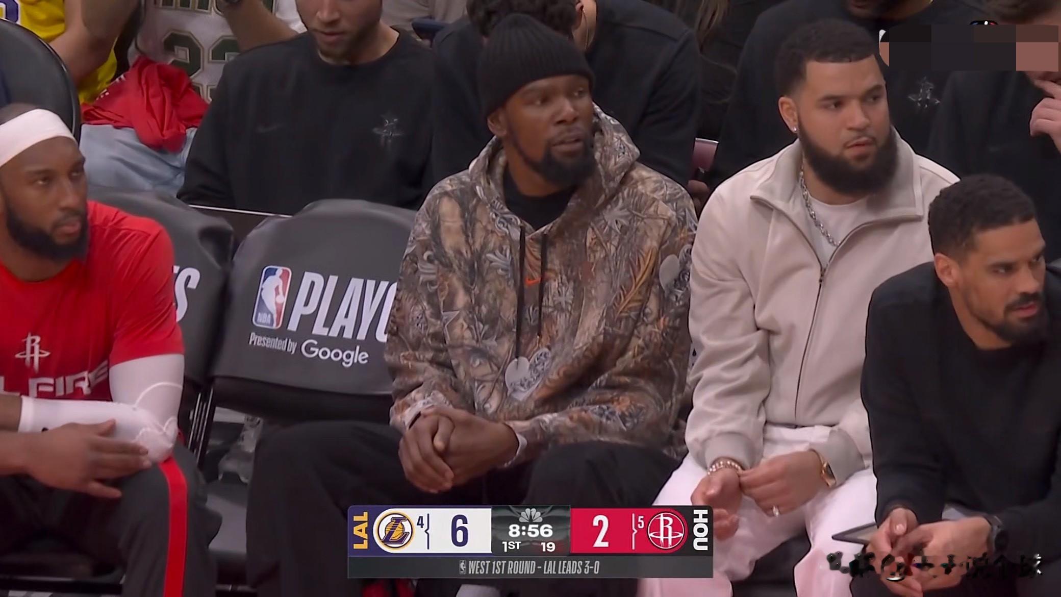 火箭对阵湖人的季后赛第四场比赛,杜兰特因伤缺阵,他坐在了替补席,眼神里充满了期待和无奈!