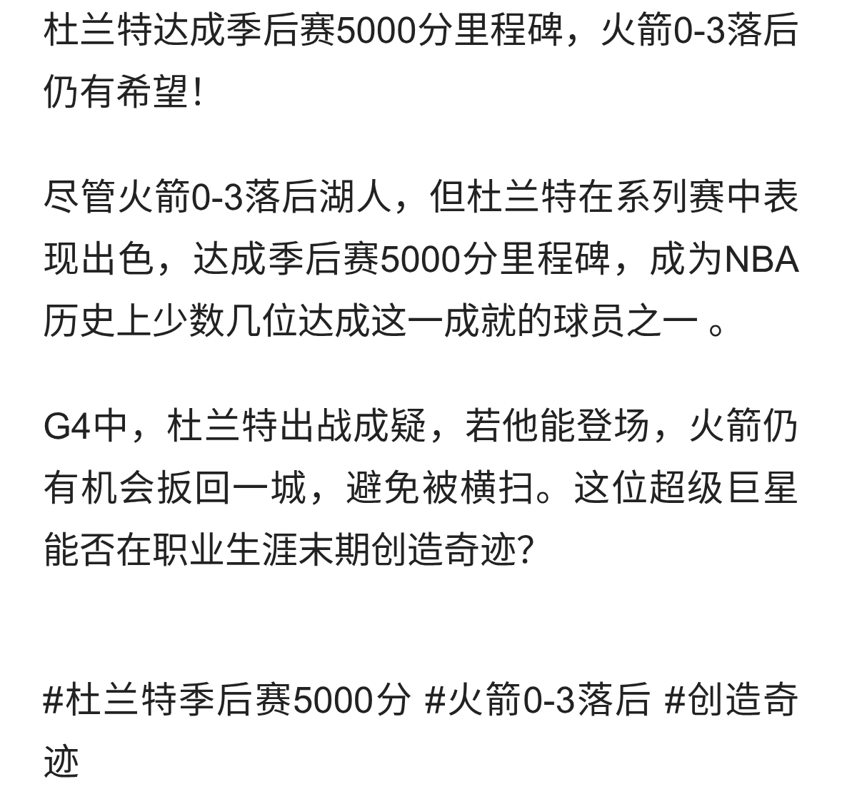 杜兰特季后赛5000分里程碑!火箭0-3落后仍有希望