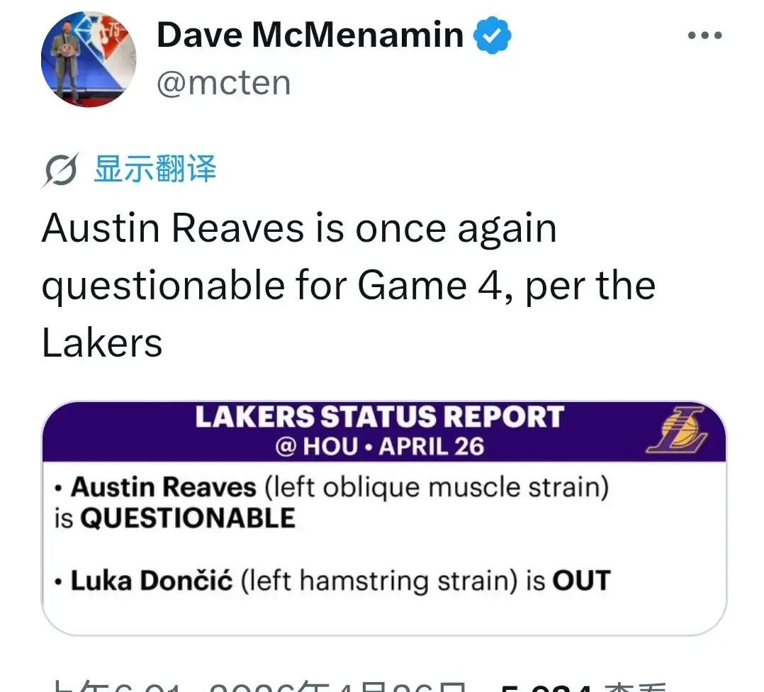 湖人公布对阵火箭G4伤病名单,多人出战状态存变数