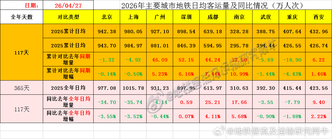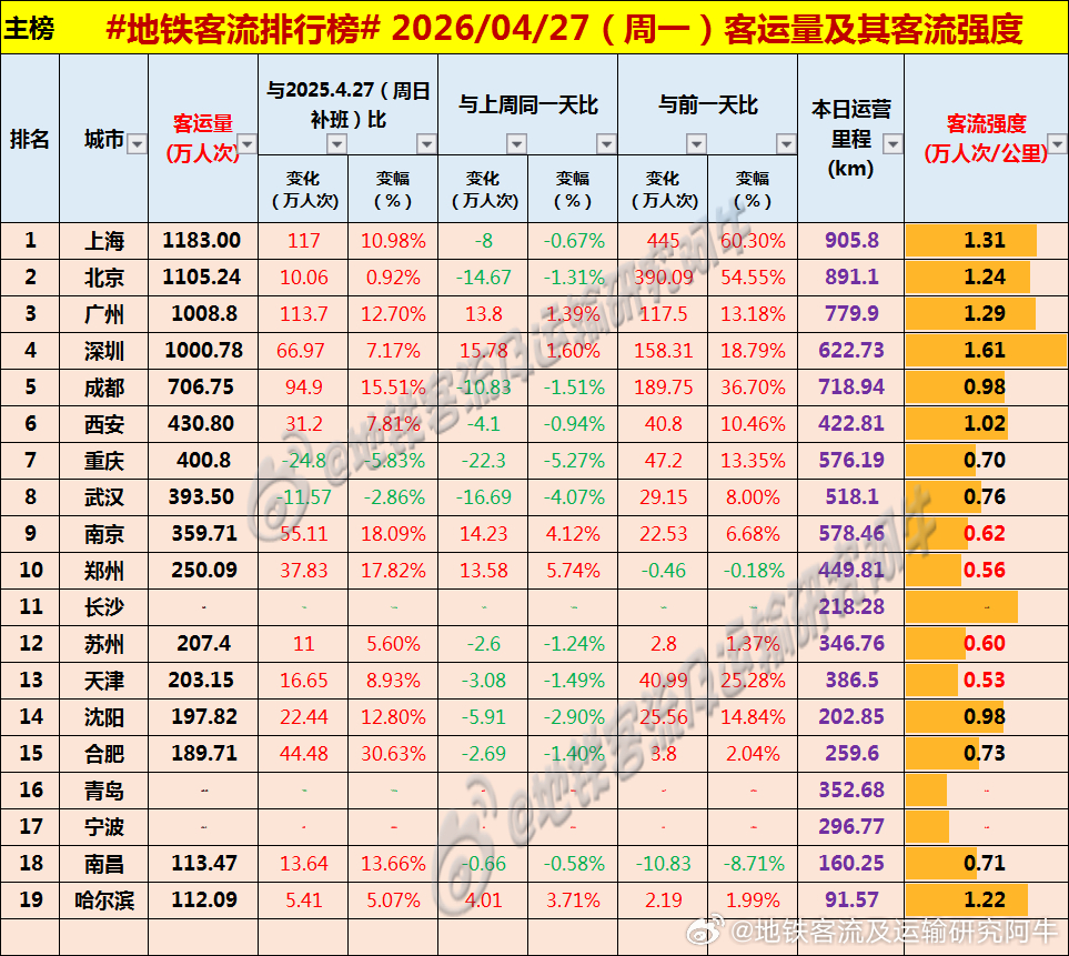 【中国城市地铁客流排行榜 2026-04-27(周一,农历三月十一,中国地铁客流日报】主榜风云:19城争霸,沪深双榜!——广深双双跃上千万!上海地铁北京地铁广州地铁深圳地铁成都地铁西安地铁重庆轨道交通武汉地铁南京地铁郑州地铁长沙地铁苏州地铁天津地铁沈阳地铁合肥地铁青岛地铁宁波地铁南昌地铁哈尔滨地铁地铁客流及运输研究阿牛的微博