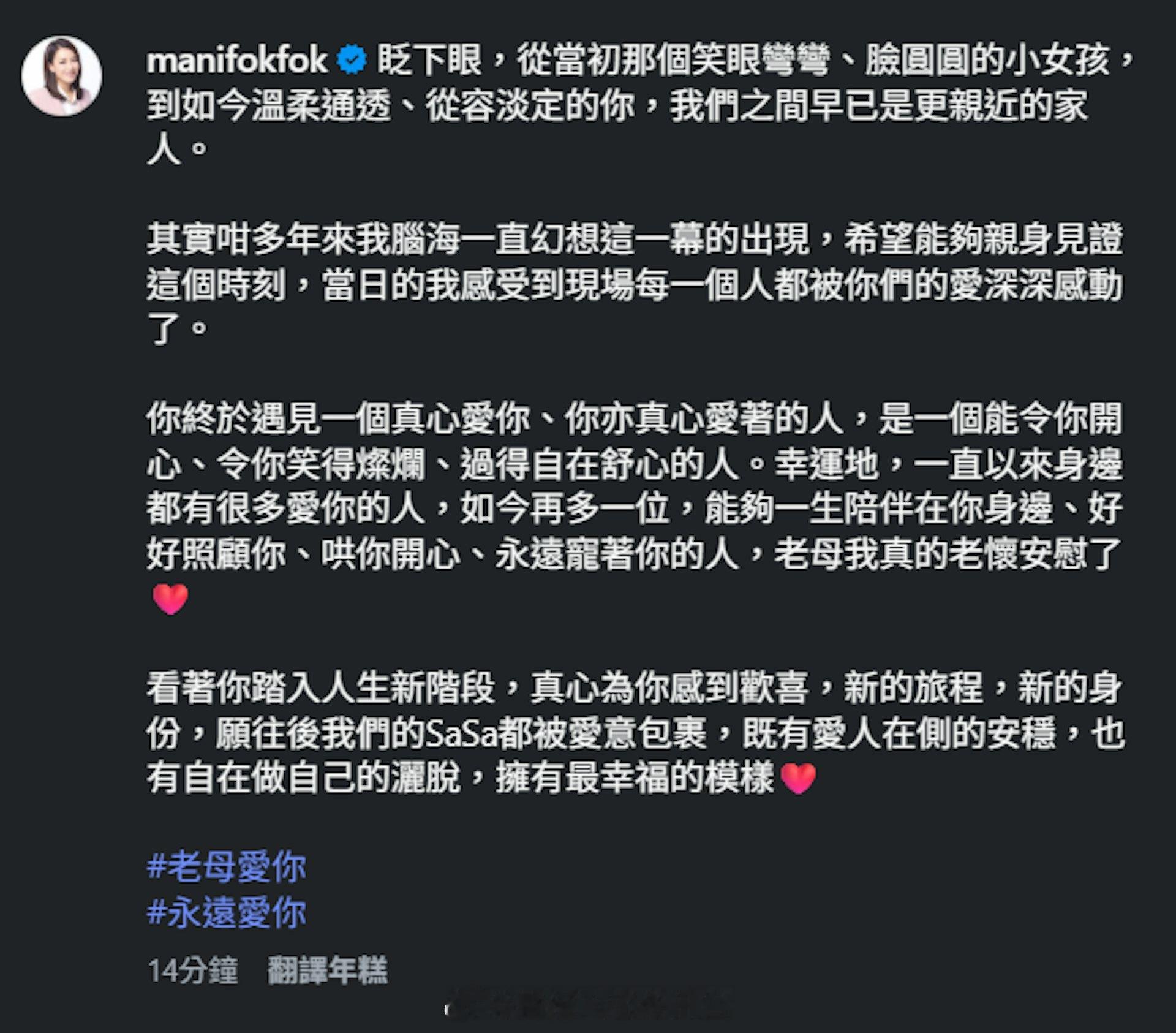 看到阿Sa终于找到属于自己的真命天子,Mani满心欣慰,更以“老母”自居,动情表示:“你终于遇见一个真心爱你、你亦真心爱着的人,是一个能令你开心、令你笑得灿烂、过得自在舒心的人。”她提到,阿Sa身边一直有很多爱她的人,如今很庆幸,又多了一位能一生陪伴、照顾她、永远宠爱她的人,直言:“老母我真的老怀安慰了❤️”