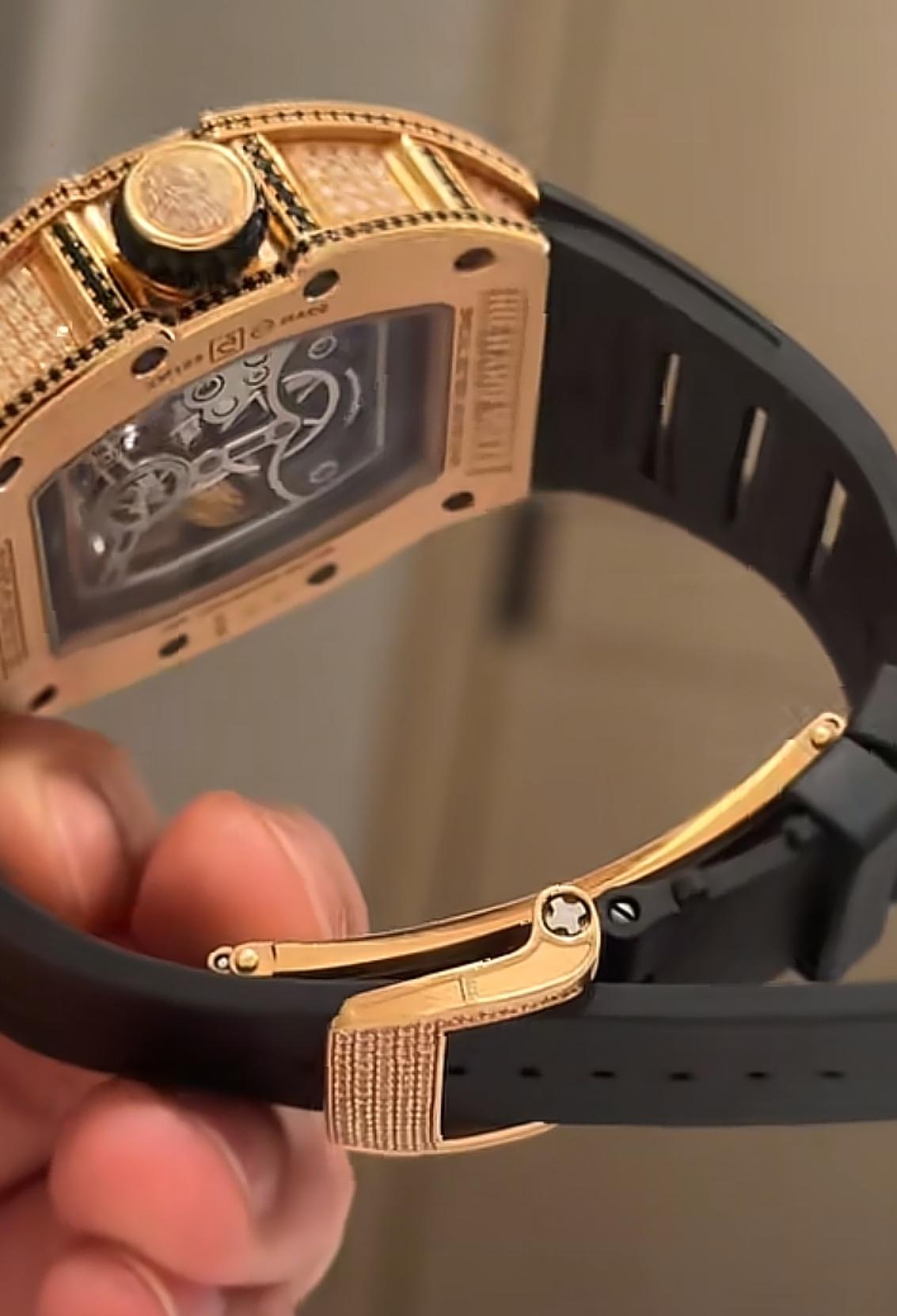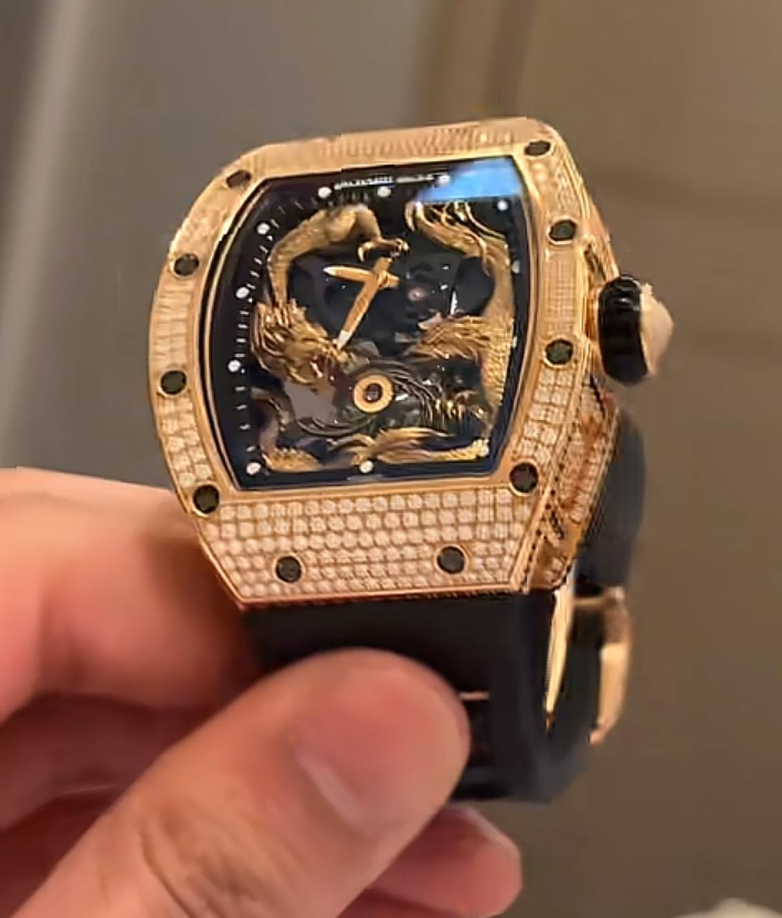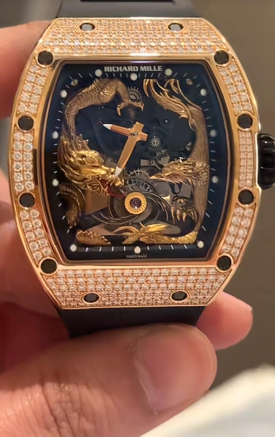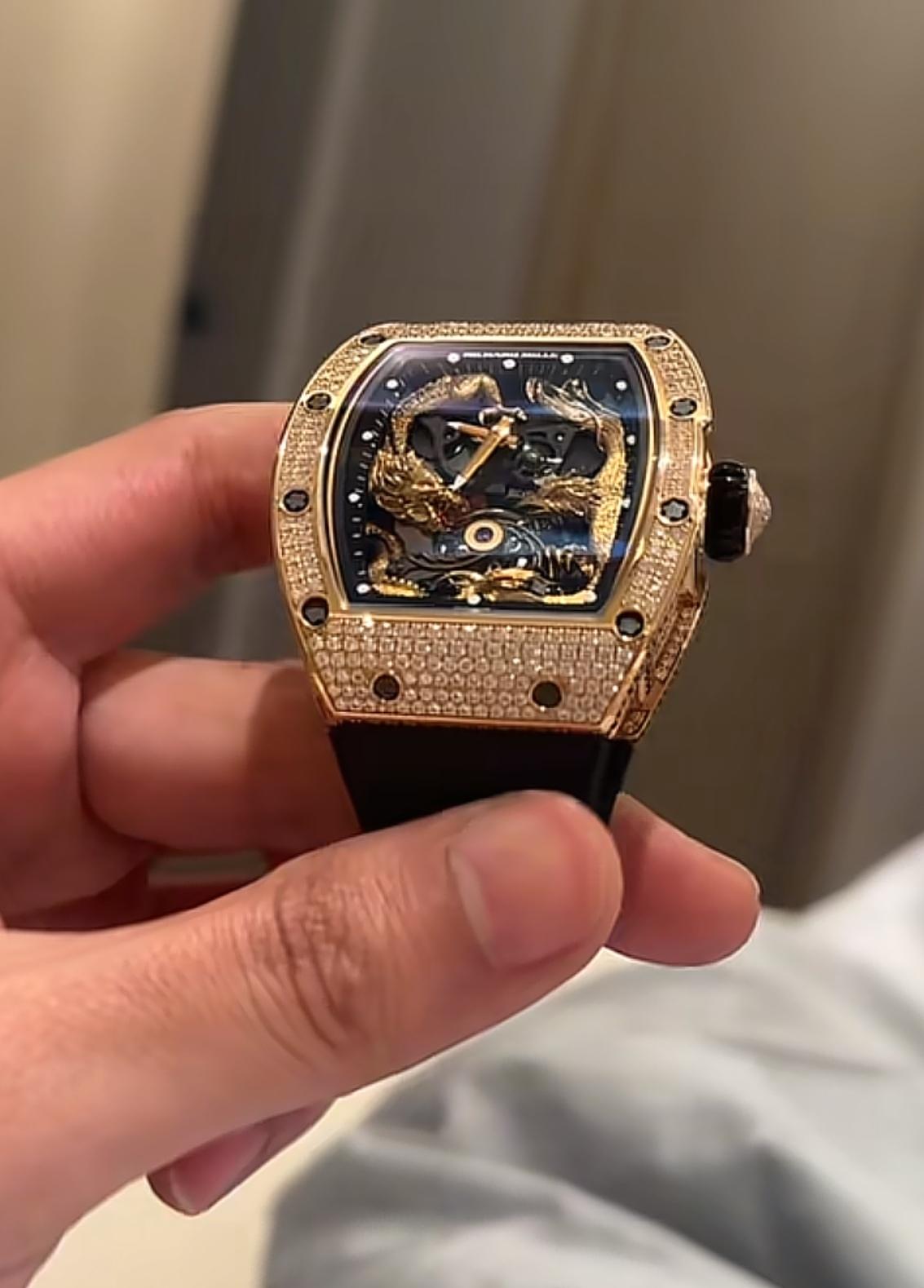 白冰曾晒出过自己的一款手表,很不一般,是理查德米勒57-01 RG玫瑰金满钻,表盘里是“龙凤呈祥”的图案,全球限量15枚。