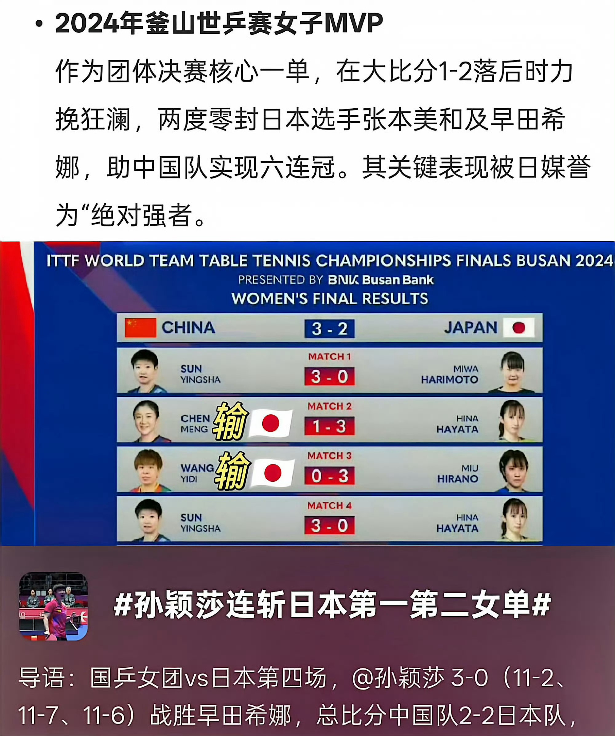 伦敦世乒赛今日开赛 两年前的釜山世乒赛决战,用惊魂一夜形容都不为过。孙颖莎作为一单3:0轻松拿下张本美和取得开门红,所有人根本没料到我们后面的二单陈梦水淋淋1:3输给早田希娜、三单王艺迪0:3干脆利落输给平野美宇差点把中国队带走吧。我们应该庆幸有孙颖莎这样胸有惊涛而面如平湖的铁血一单,是她在危机时刻再次挺身而出雷厉风行3:0暴揍了早田才为中国队赢得了生机和气势。但是竞技体育没有这么多逆风翻盘的续集,25岁的孙颖莎再强她也是血肉之躯不可能一直硬扛重压。团体赛的核心就是无论什么境况人人要为自己那一分全力以赴,有短板又心虚的人趁早抱佛脚练起来。教练组也要协调资源保障绝对一号位备战,不能像24亚锦赛那样连轴上场导致最后决赛心有余力不足没办法替输了的人兜底。王楚钦孙颖莎凌晨到达伦敦