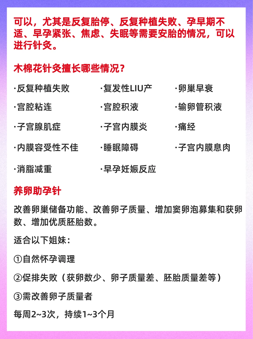 当然可以。尤其适合有反复胎停或移植失败经历的姐妹,以及孕早期明显不适、紧张焦虑、睡眠不佳的情况。针灸的作用是帮助改善母体状态,为胚胎发育提供更安稳的内在环境。