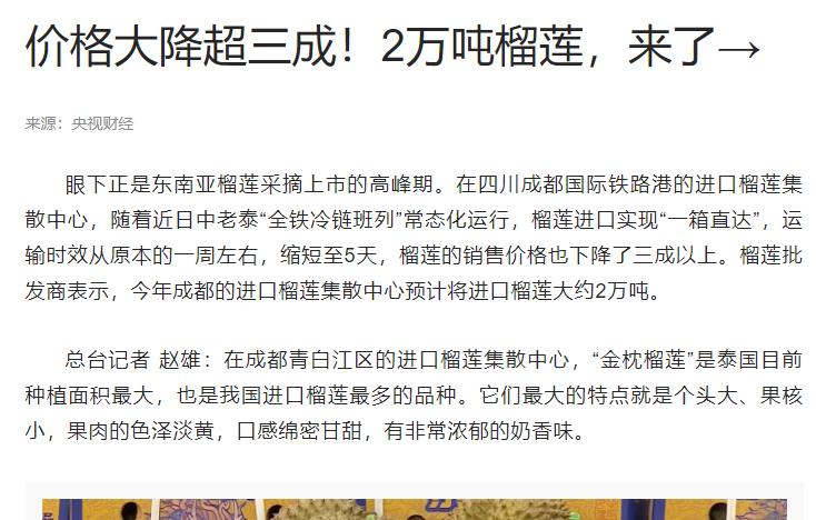 为啥能降这么多?核心就一个,运输方便了,成本降下来了。以前咱们吃的进口榴莲,要么铁路转公路,要么走海运,从泰国运到成都,最少得一周。