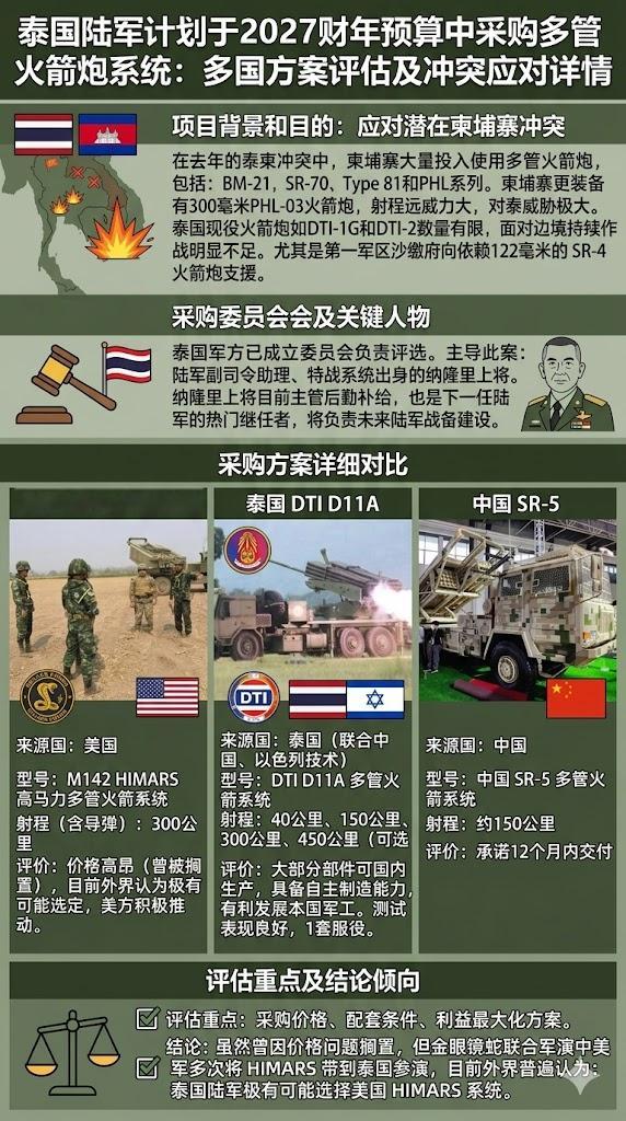 泰国也打算采购“海马斯”(HIMARS)火箭炮,以应对可能与柬埔寨发生的冲突,中国SR-5、泰国国防工业株式会社(DTI)的D11A也在考虑之列,目前正在评估价格和报价。军事ai新视野ai热力追踪