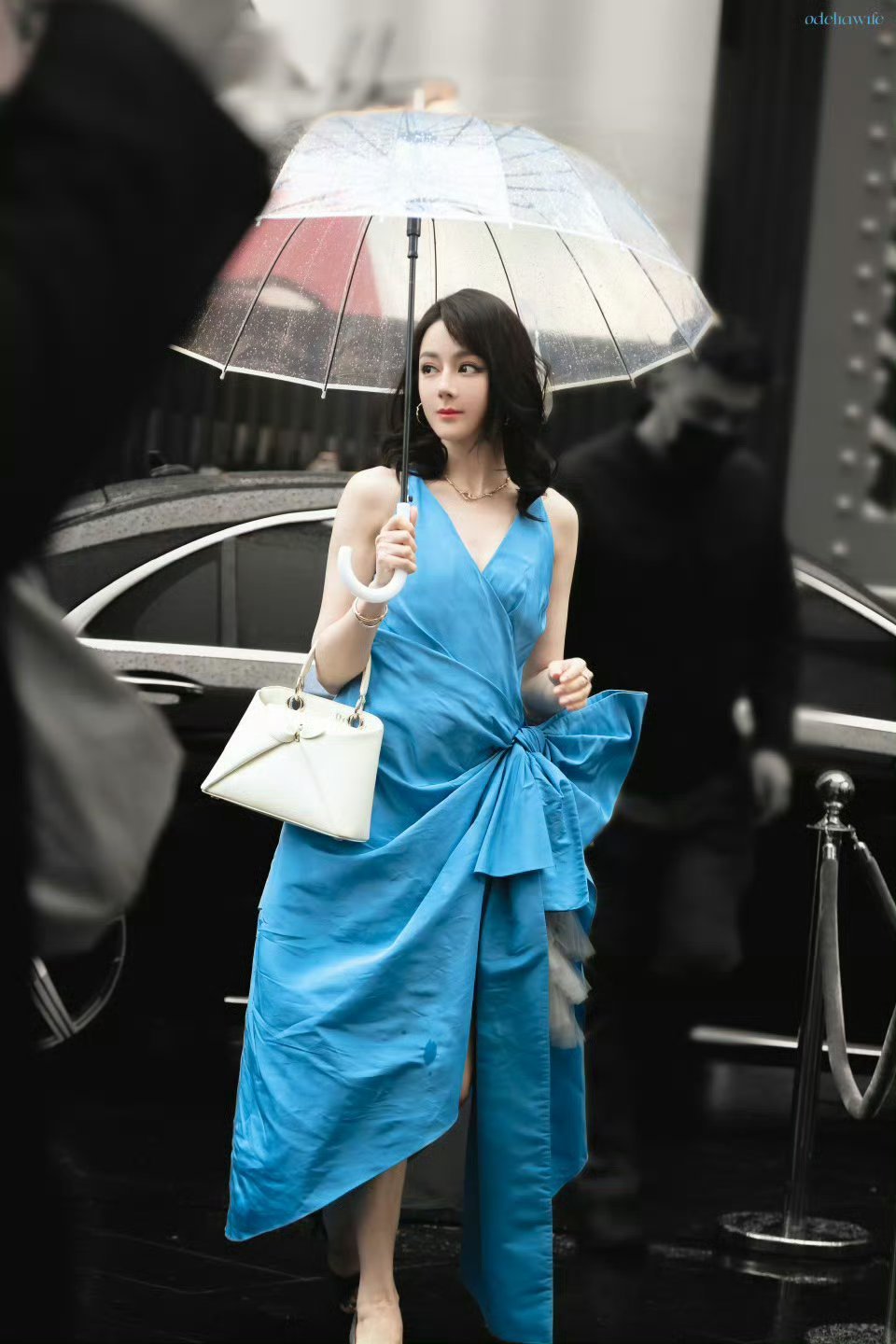 今天迪丽热巴在出席活动的时候变身雨中女神,她这回特意挑选了一件蓝色的裙子,这件裙