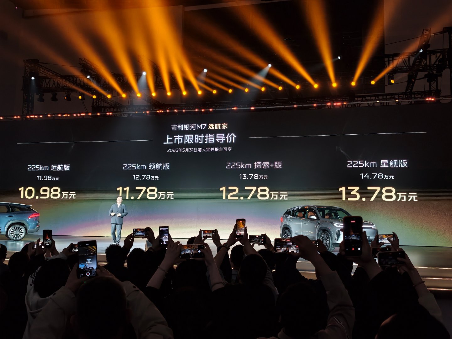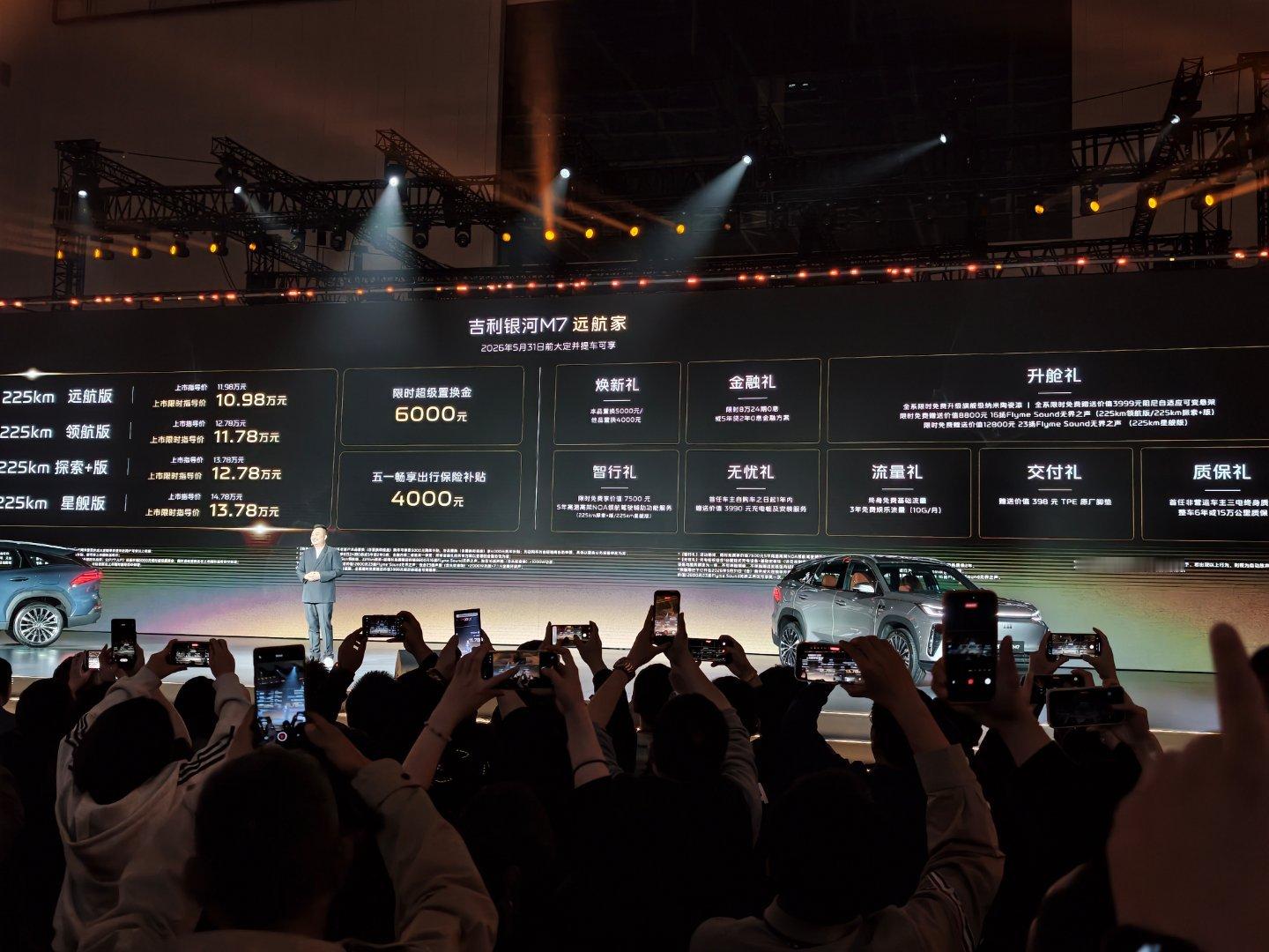 吉利银河M7首销价10.98万元起!就问你们香不香!以越级实力打破价格壁垒,重新定义主流插混SUV新高度!外观承袭中式美学设计,飞檐虎视前脸搭配星汉涟漪贯穿灯,362颗灯珠点亮科技锋芒,20英寸大轮毂加持,运动气场拉满。内饰轻奢质感拉满,15.4英寸2.5K高清中控屏,搭配麂皮包裹与水晶组件,大五座宽适空间兼顾家用与舒适。硬核动力续航拉满,神盾金砖电池加持,最高225km纯电续航、1730km综合续航,馈电油耗低至3.35L,通勤零油耗、长途无焦虑。全系标配千里浩瀚H3智驾方案,高速NOA、自动泊车轻松拿捏,麋鹿测试81km/h,操控性同级领先 。10万价位享20万级配置,颜值、性能、智能全面越级,家用代步、长途出行全场景适配,性价比直接拉满!吉利银河M7远航家10.98万起吉利银河M7远航家上市