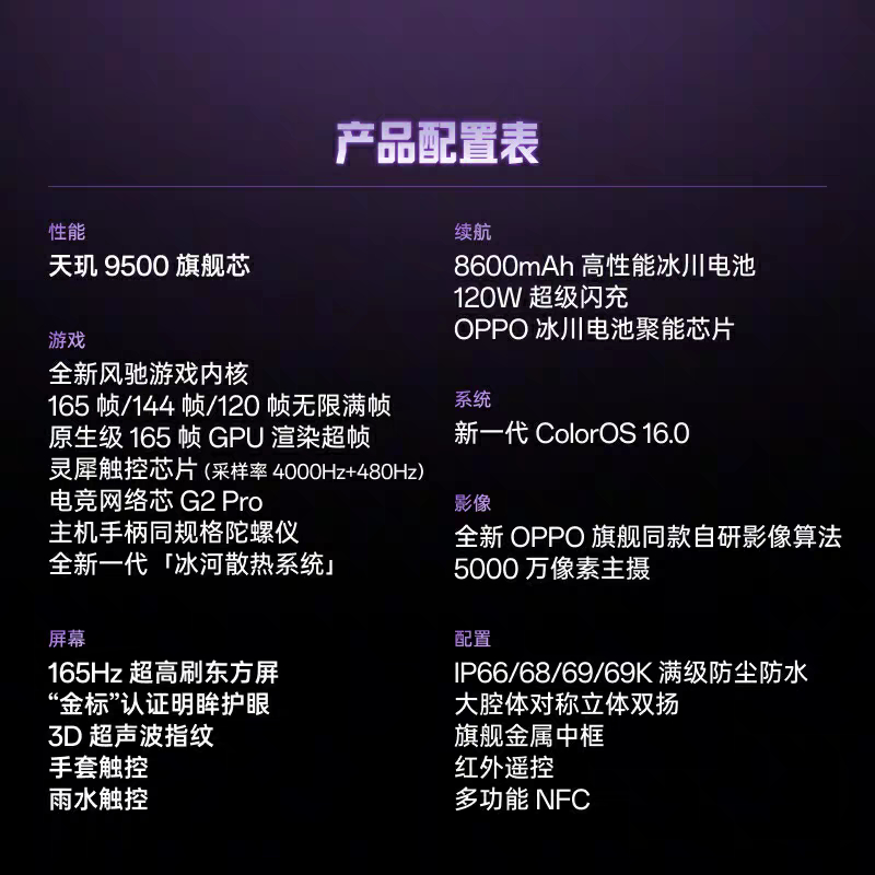 5.其他:ColorOS 16, Wi‑Fi 7、蓝牙5.4、NFC、红外遥控、3D超声波指纹、面部识别,IP66/68/69/69k,王牌觉醒、金属风暴配色,12GB+256GB 首销3499 元起!