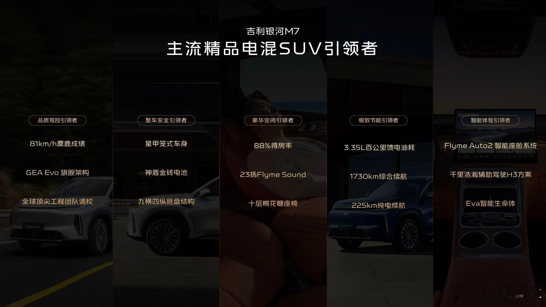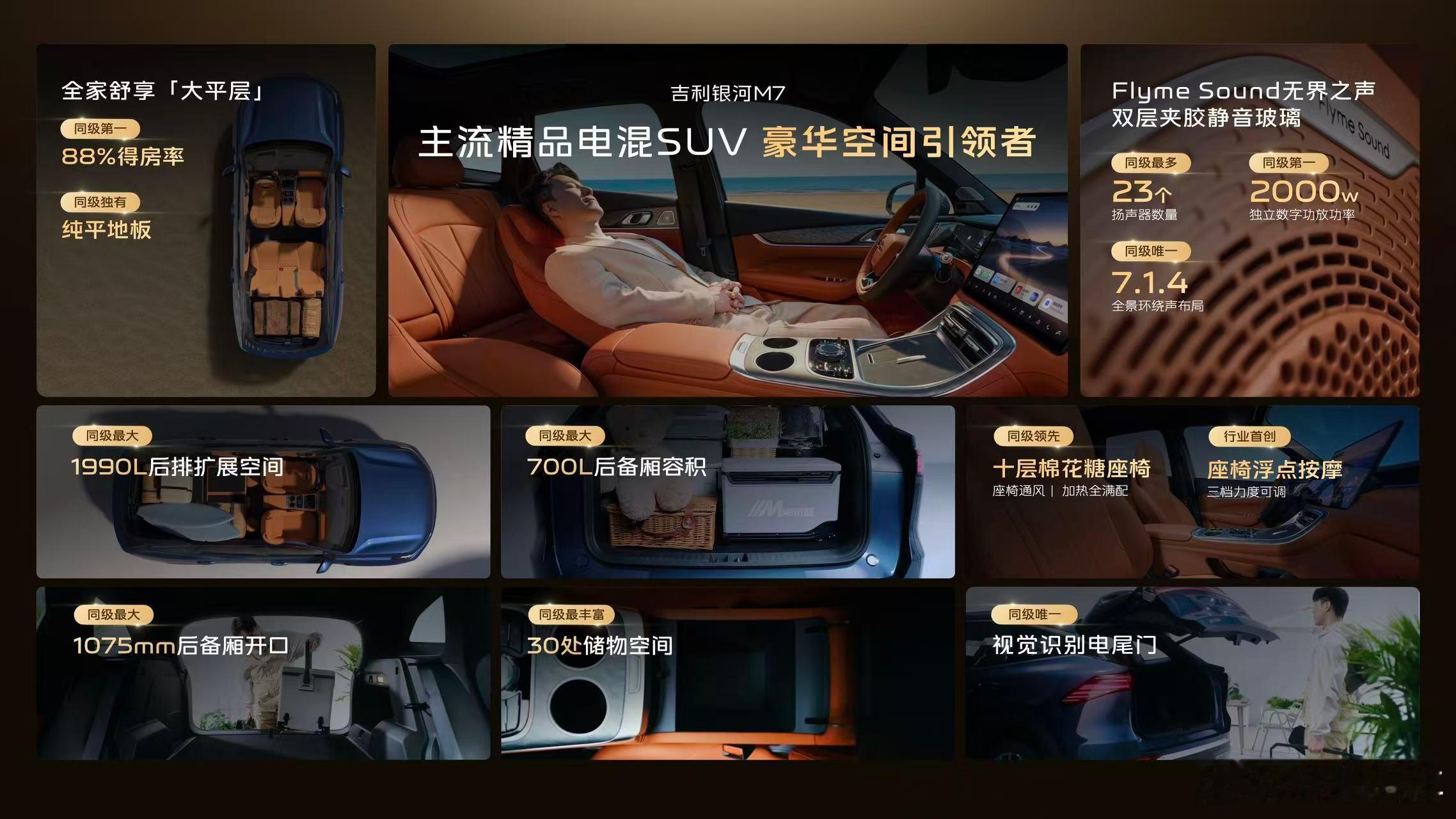吉利银河 M7 不只是在卷同行,它卷的更是自己。标配高速 NOA,可变阻尼减震相当于也是标配。这个价位无论是从底盘操控、车身用料、配置、智能化,比目前市面同级产品都要优秀。吉利银河的下一个爆款!吉利银河M7远航家 上市限时指导价10.98万元起!三大技术尖点 | 五大全面引领开启吉利银河两百万新征程抢先下定享上市限时权益!主流精品电混SUV引领者