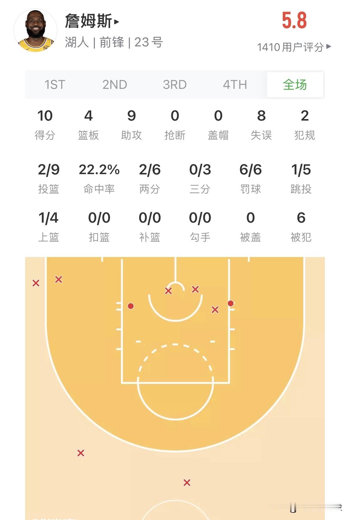 实事求是地说,詹姆斯这样的表现完全对不起他的历史地位,说他是本场比赛的失误大王,一点也不冤枉他。他在进攻端不仅频频打铁,外线完全哑火,而且传球更是接连被火箭抢断,8次失误直接送给了对手大量反击机会。