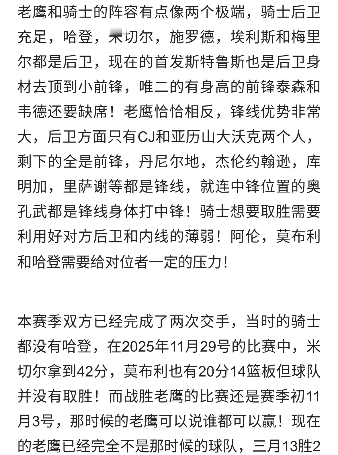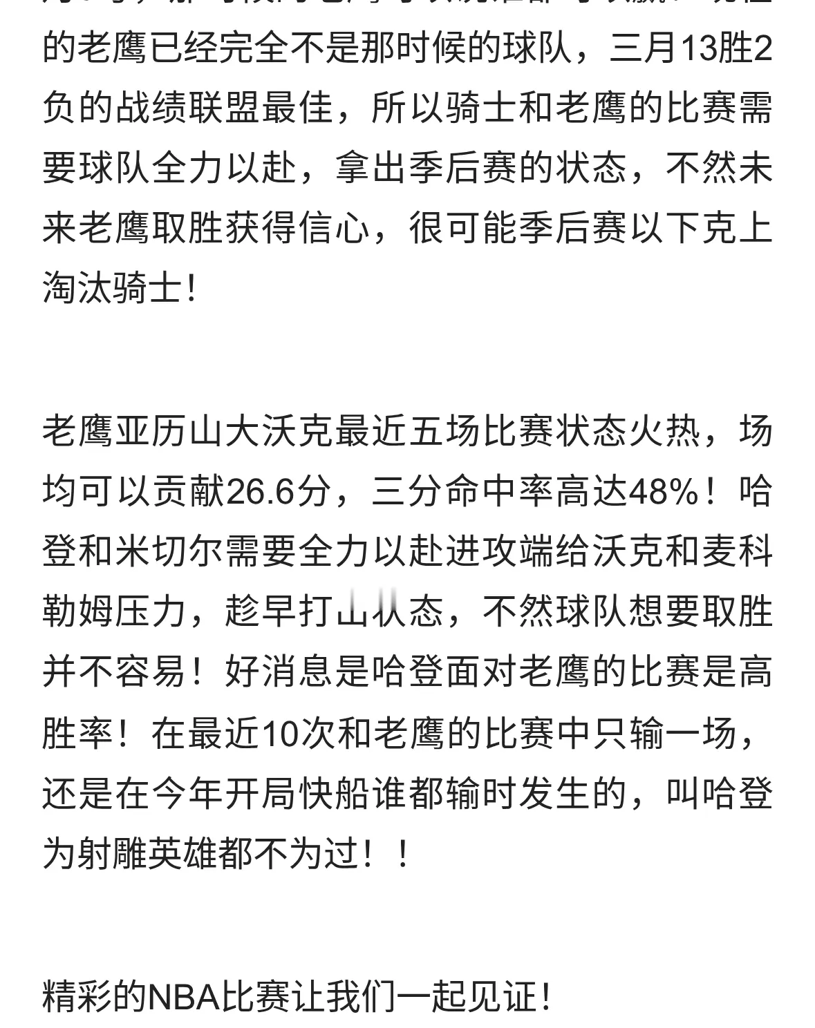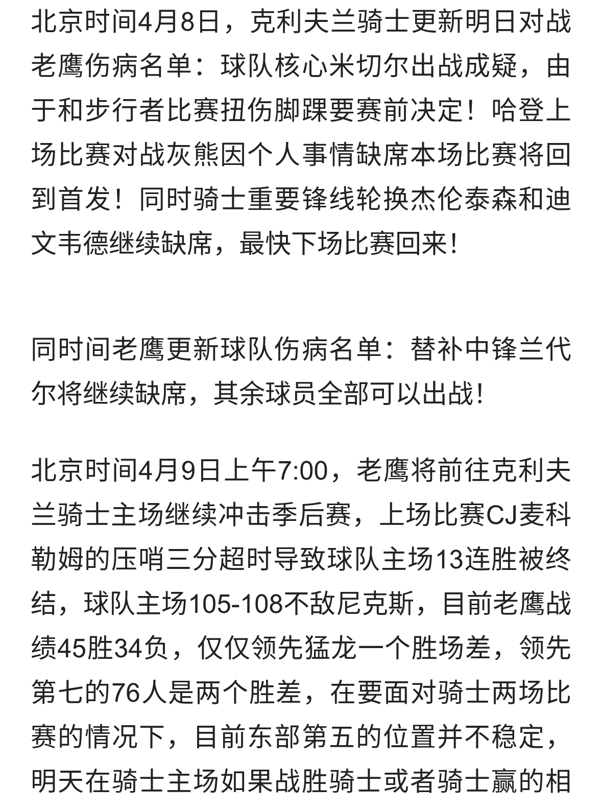 骑士老鹰更新明比赛伤病名单:哈登回归泰森韦德缺席&老鹰兰代尔