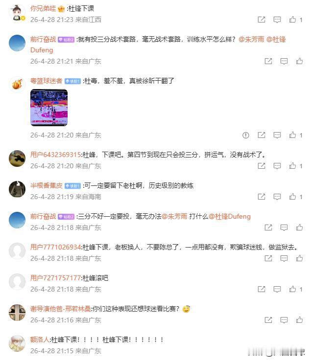 CBA季后赛附加赛,广东主场爆冷不敌广州!在赛后广东男篮社媒最新评论区留言,都是建议立刻开除主帅!呼吁杜锋下课,本场杜锋执教存在五大失误!