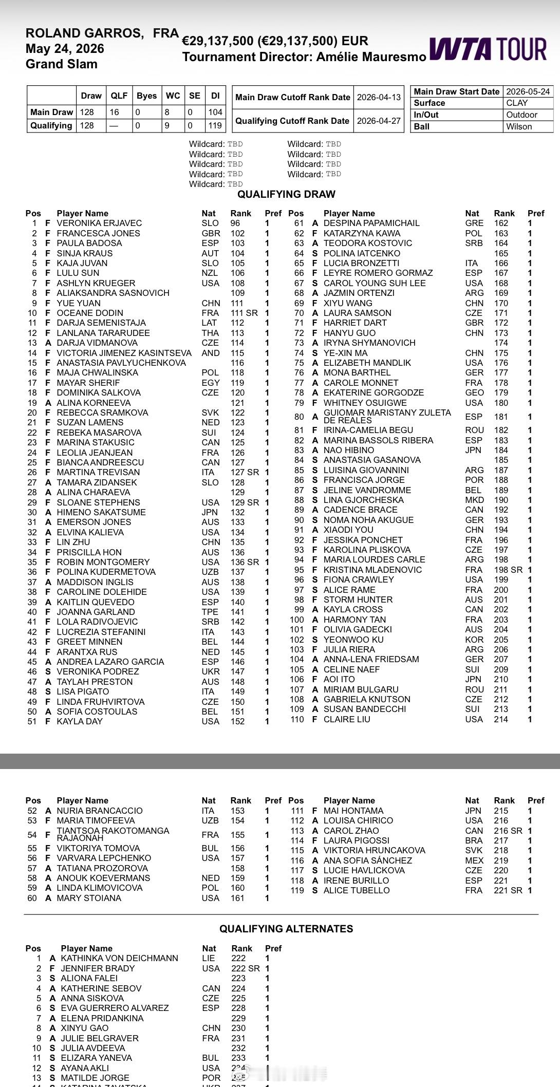 法网2026 资格赛名单女单:袁悦🇨🇳、朱琳🇨🇳、王曦雨🇨🇳、郭涵煜🇨🇳、马烨欣🇨🇳、尤晓迪🇨🇳六人入围,高馨妤🇨🇳暂列替补第八位(发完外卡大概率压线入围)