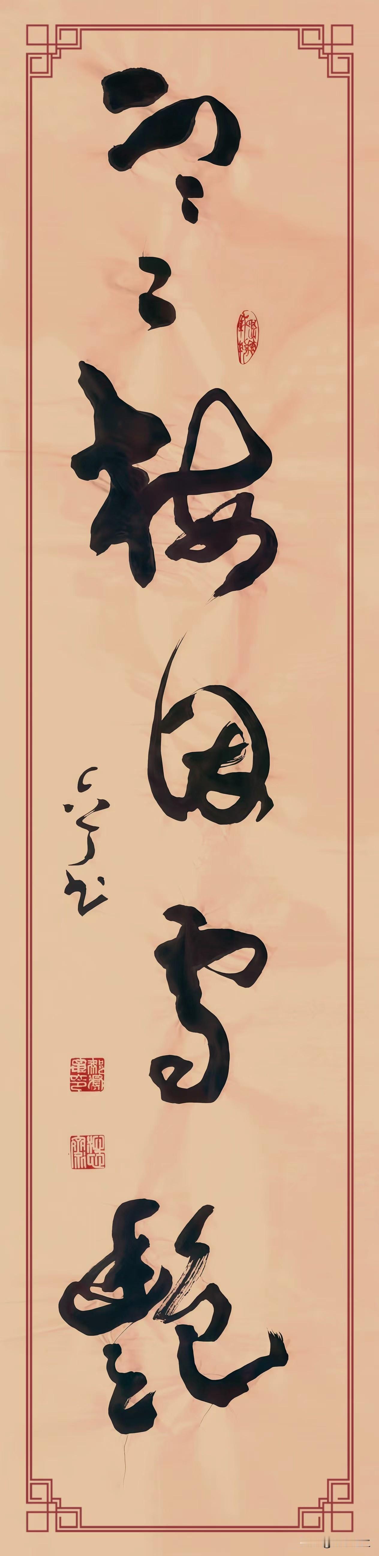 飛燕為春歸》这幅草书对联气韵流畅,笔势奔放。上联“寒梅因雪艳”以苍劲笔触写梅之傲骨,枯润相生;下联“飞燕为春归”线条灵动,如燕舞春风,动静相映。整作墨色浓淡变化自然,结体开合有度,将“寒梅傲雪、飞燕迎春”的意境,以草书中的狂放与雅致,融为一体,兼具笔墨意趣与文人情思,格调清逸。