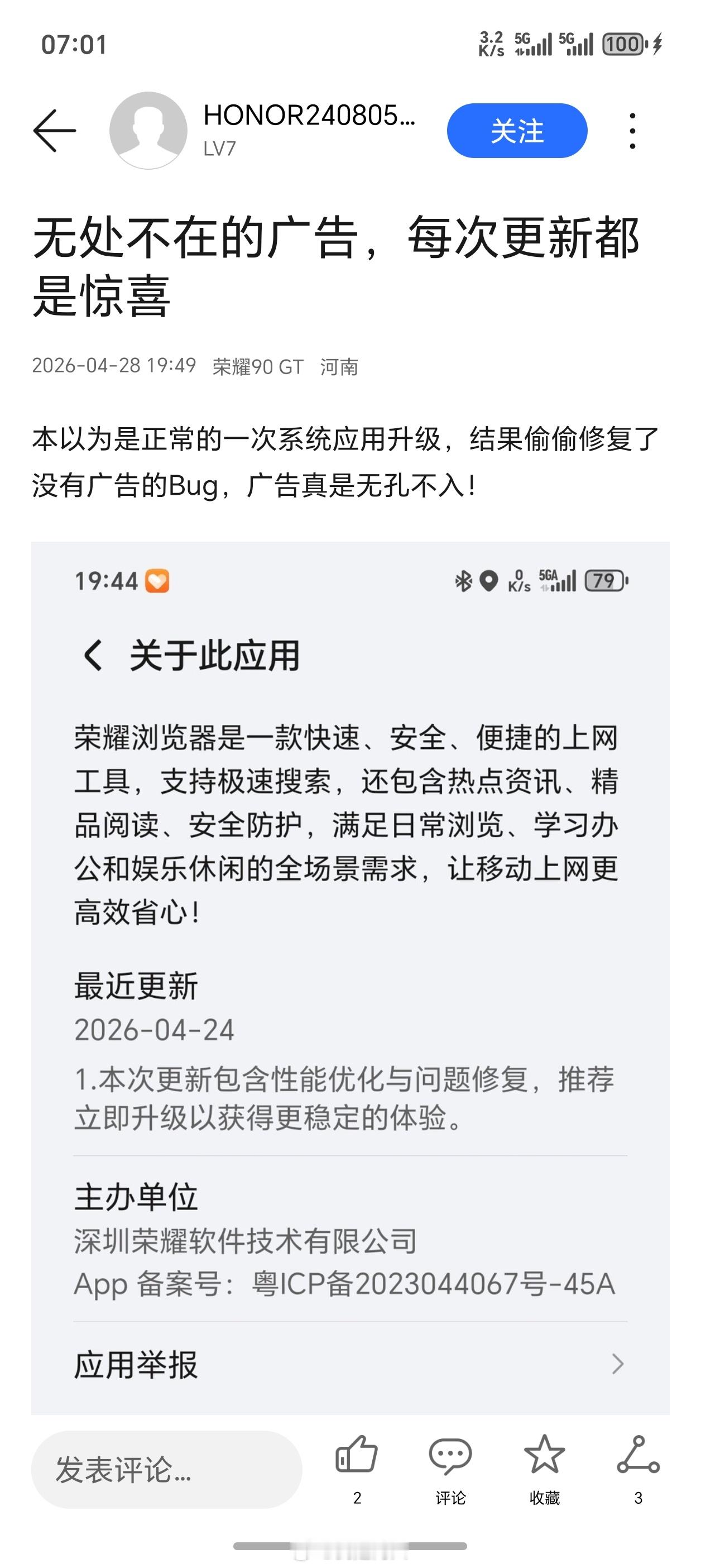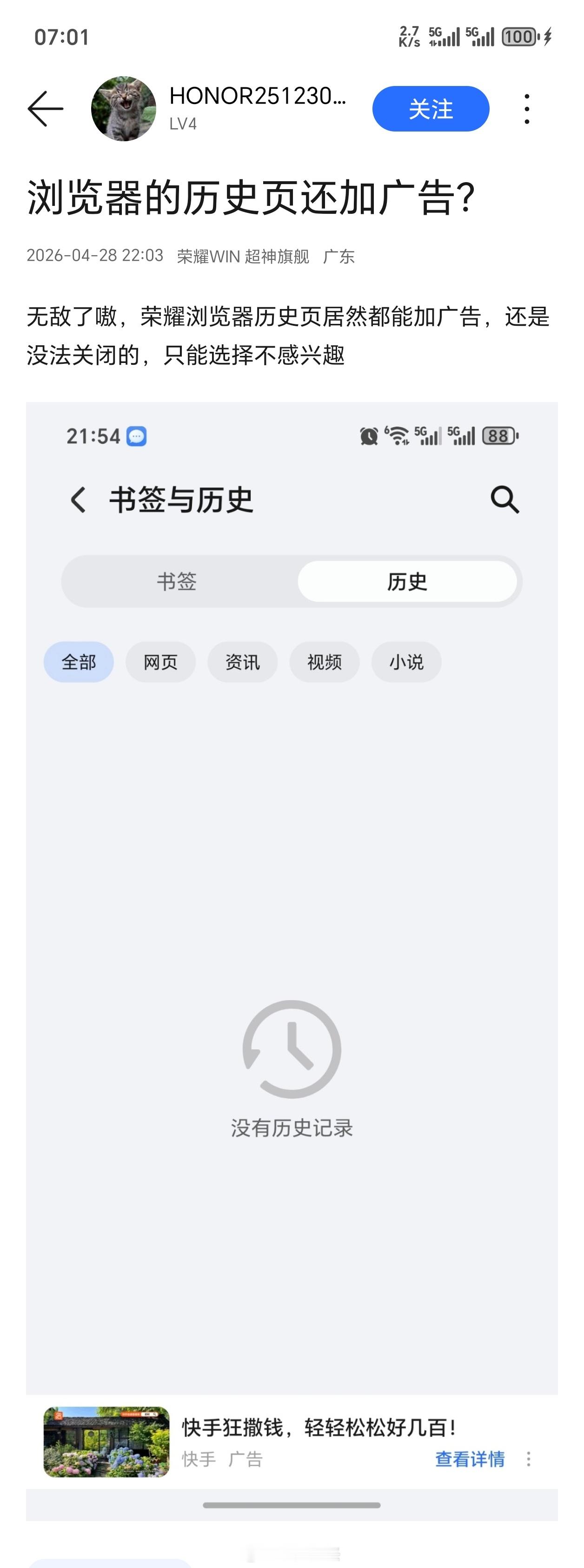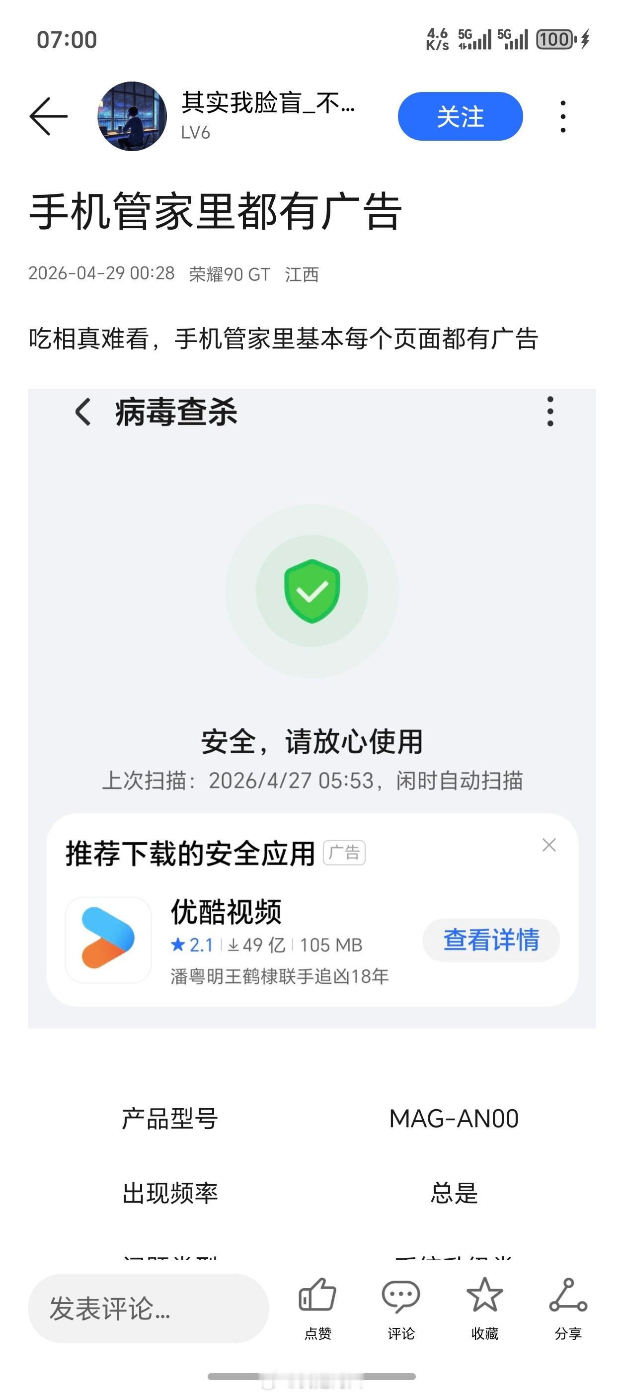 我看了一下荣耀官方俱乐部的用户反馈,而且都是最近发的,最近荣耀在手机系统里面疯狂加广告啊,有的广告加的都非常离谱。
