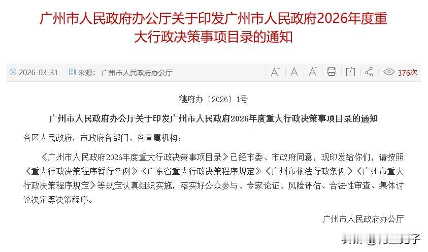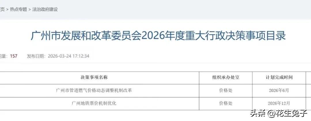 广州3月31日发布“2026年度重大行政决策事项目录”,其中燃气价格动态调整机制改革、地铁票价机制优化两项内容引发关注,燃气方面计划在2026年6月完成调整改革,地铁票价则在2026年12月完成。