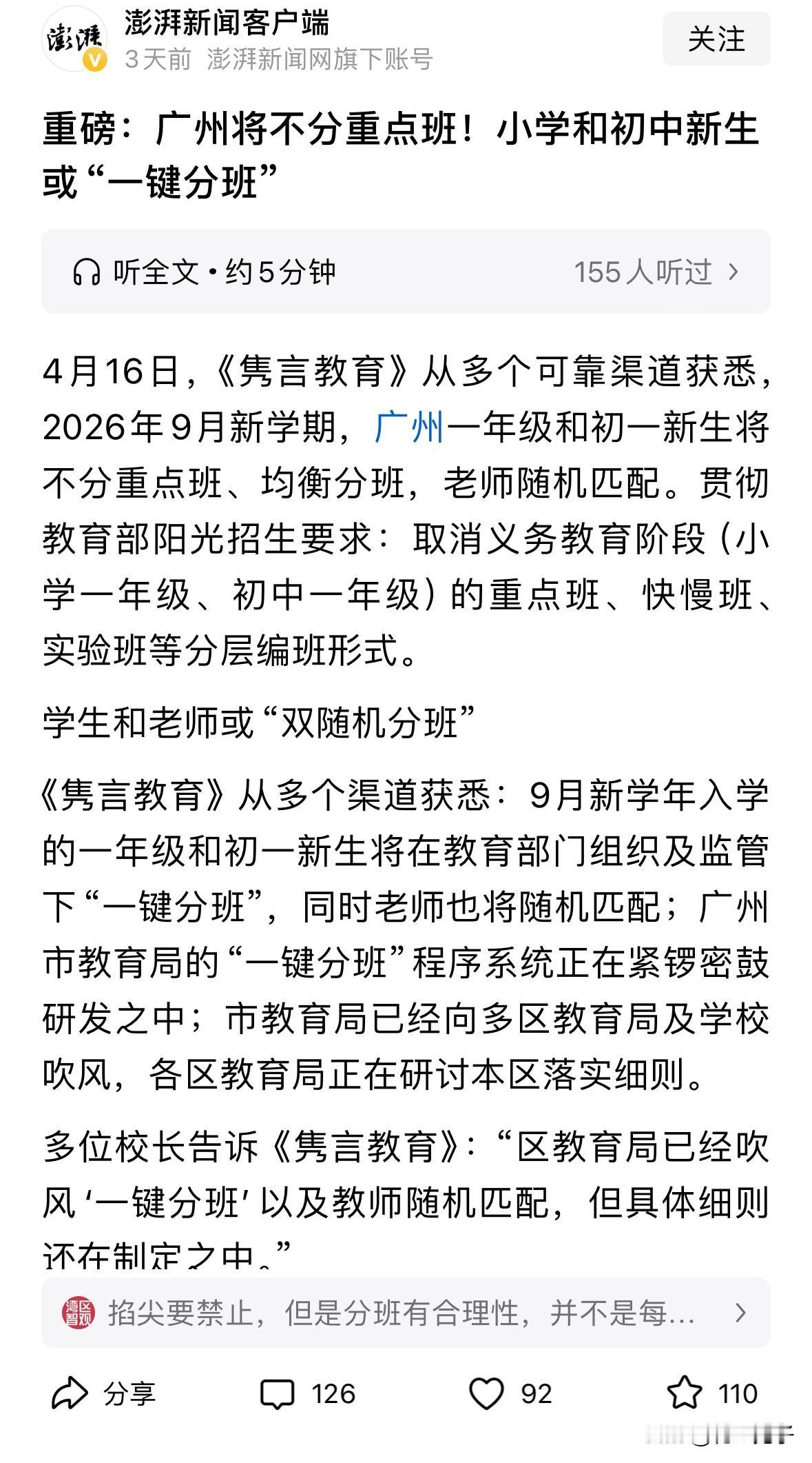 网传广州今年九月起义务教育阶段不再划分重点班、尖子班,老师也随机分班。