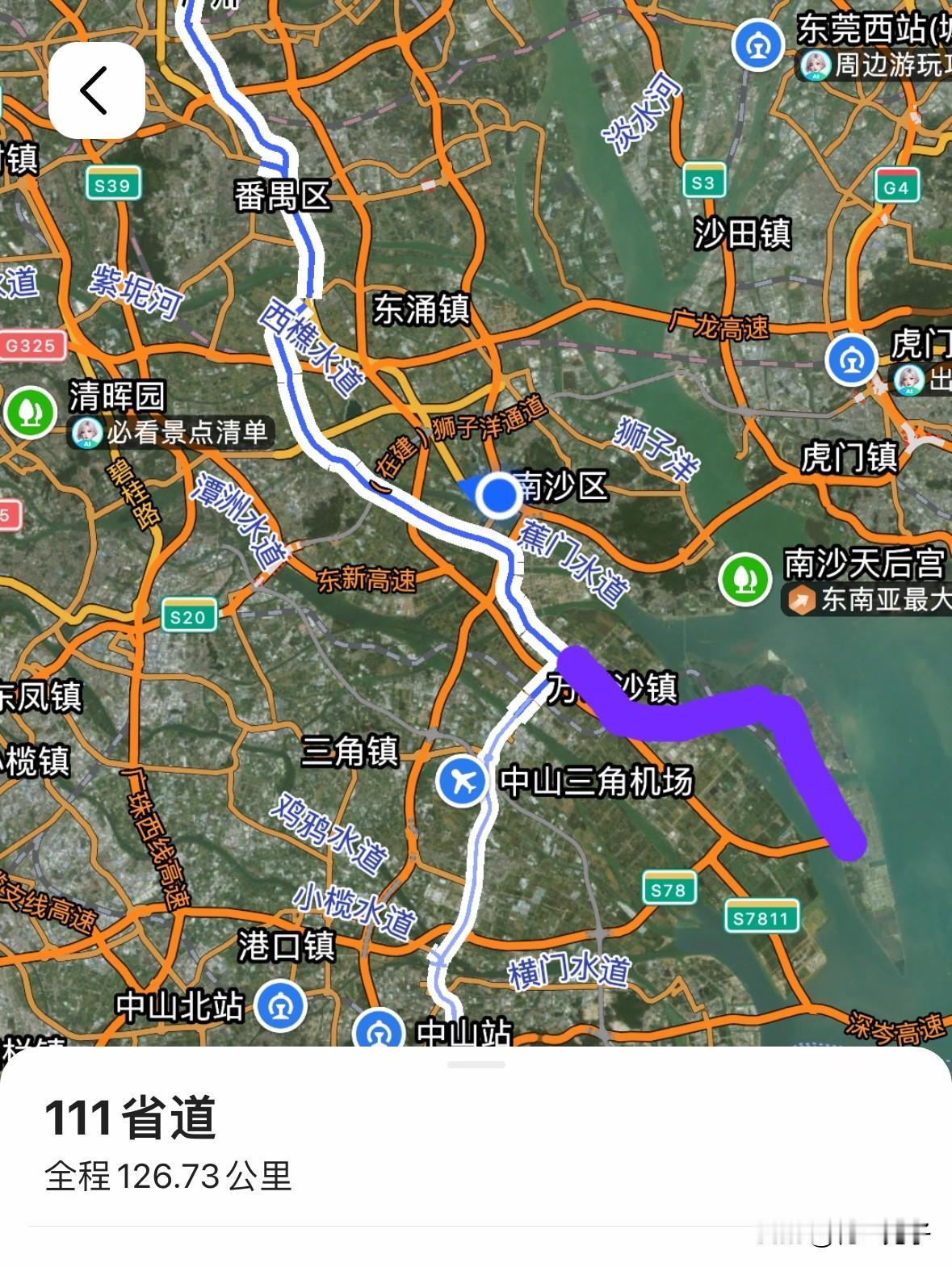 如果不是从南沙辖区内前往南沙港各期的码头,比如说从番禺方向开去南沙港码头,有没有完全可以避免禁行的路段呢?看了一下地图,有是有,走111省道(番中公路),经过上横沥大桥、下横沥大桥,随后进入灵新大道,转进红莲大桥,就进入了龙穴岛。(图12)