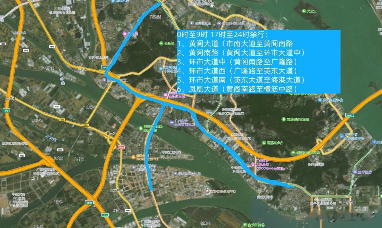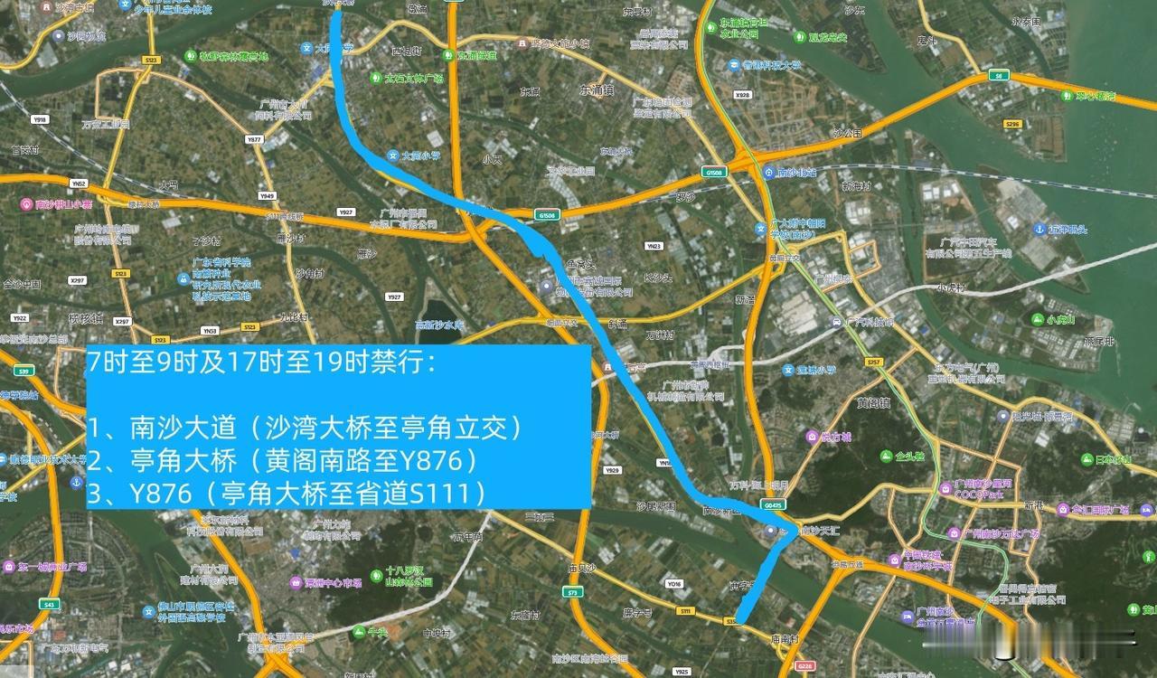 1.南沙大道-黄阁南路-亭角大桥路段,采取与黄阁大道-黄阁南路-环市大道同样的夜间禁行时段(17时至次日9时);