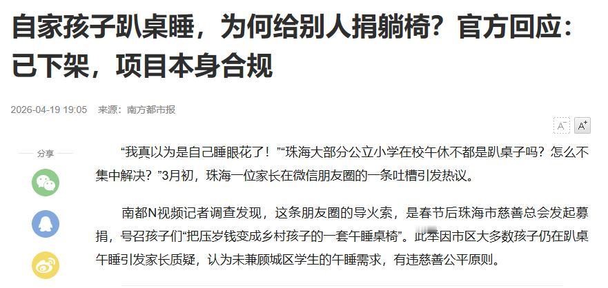 珠海的家长看了,当场就炸毛了,自己家的孩子,还在桌子上趴着午睡,却让孩子们捐压岁钱给乡村孩子买躺椅,慈善总会的脑回路很奇葩呀。结果慈善总会还振振有词,项目本身仍合规运行,只是把推文下架了。