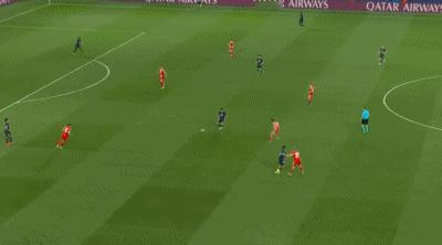 拜仁对阵巴黎圣日尔曼的比赛82分钟:帕夫洛维奇上抢断球,拜仁形成了前场4打3的机会。当奥利塞持球摆脱的时候,后点的格雷茨卡正好跑位至无人防守的真空并举手要球。