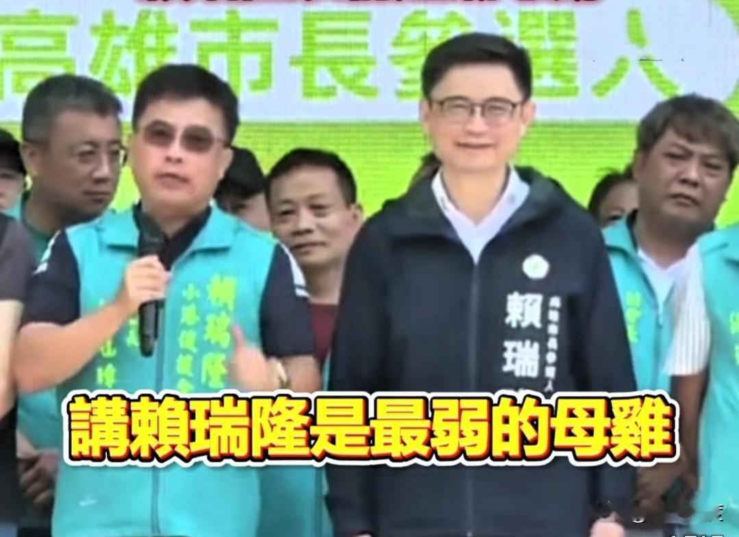 日前高雄市长参选人赖瑞隆在一场造势活动上,被站台的桩脚当众指出是所有参选人当中“最弱的母鸡”。该位桩脚表示,最近媒体啦,说那些我听不下去的话,他们说哦,讲赖瑞隆是最弱的母鸡啊,赖瑞隆是里面最弱的母鸡。